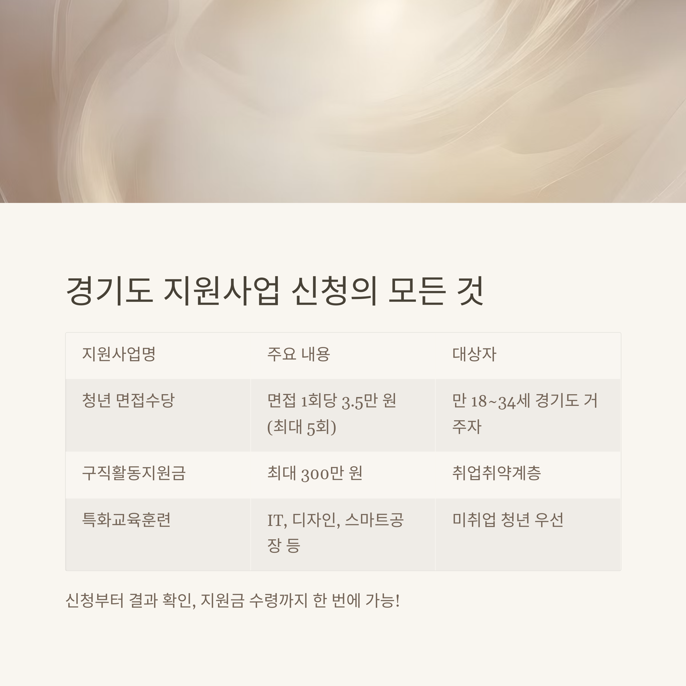| 청년 면접수당 | 면접 1회당 3.5만 원 지급 (최대 5회) | 만 18~34세 경기도 거주자 |