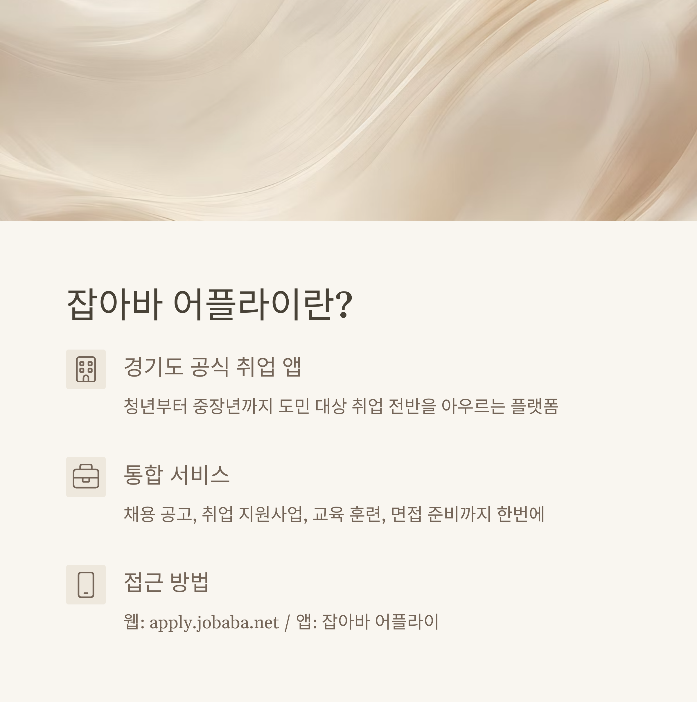 ‘잡아바 어플라이’는 채용·교육·지원사업을 한번에 신청하는 경기도 통합 플랫폼입니다.