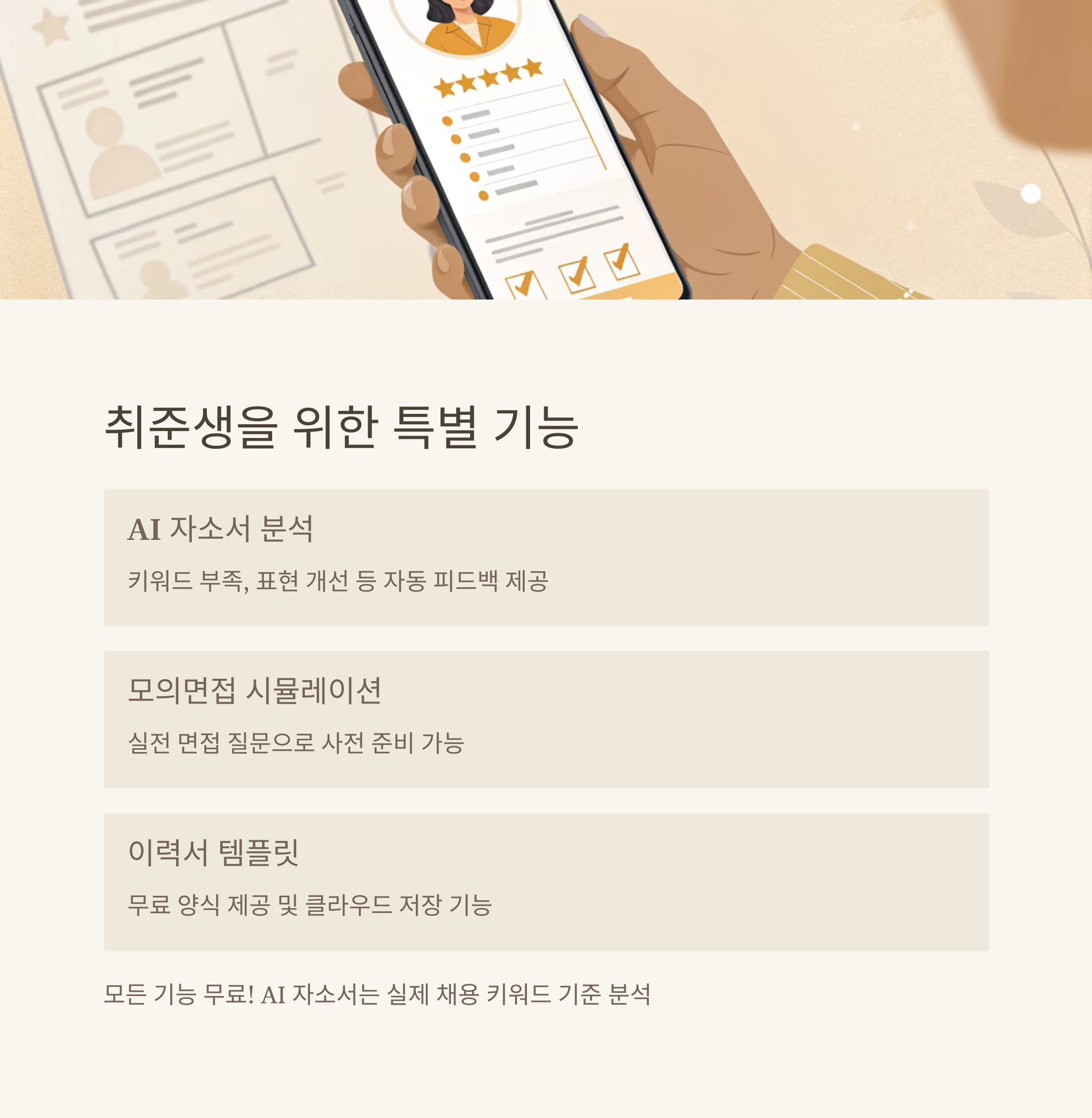 특히 AI 자소서 기능은 실제 채용 키워드를 기준으로 분석해 취업률 향상에 도움을 줍니다.