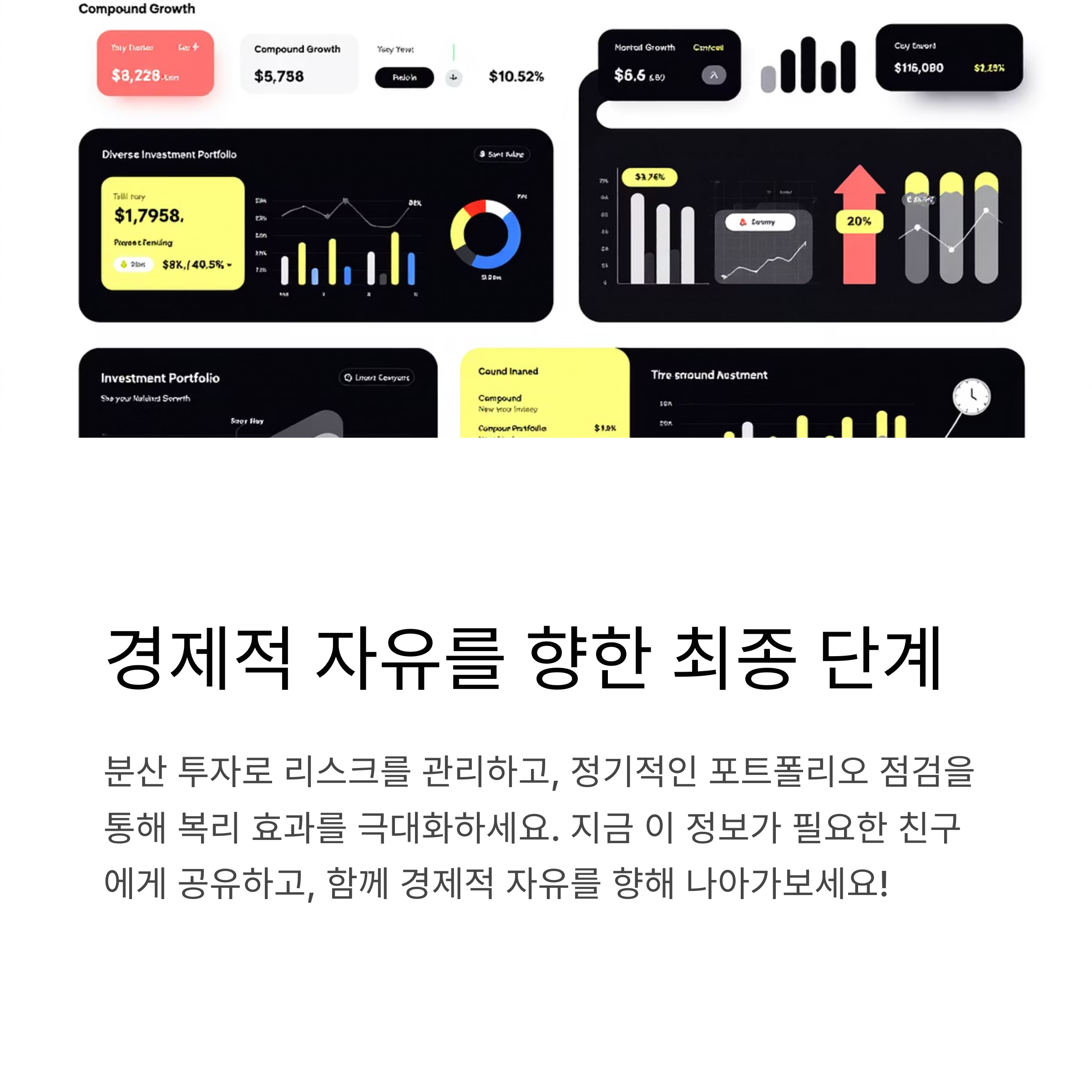 - 시간을 아군으로 만들기: 복리 효과는 시간이 지날수록 커집니다. 일찍 시작하는 것이 가장 큰 경쟁력입니다.
