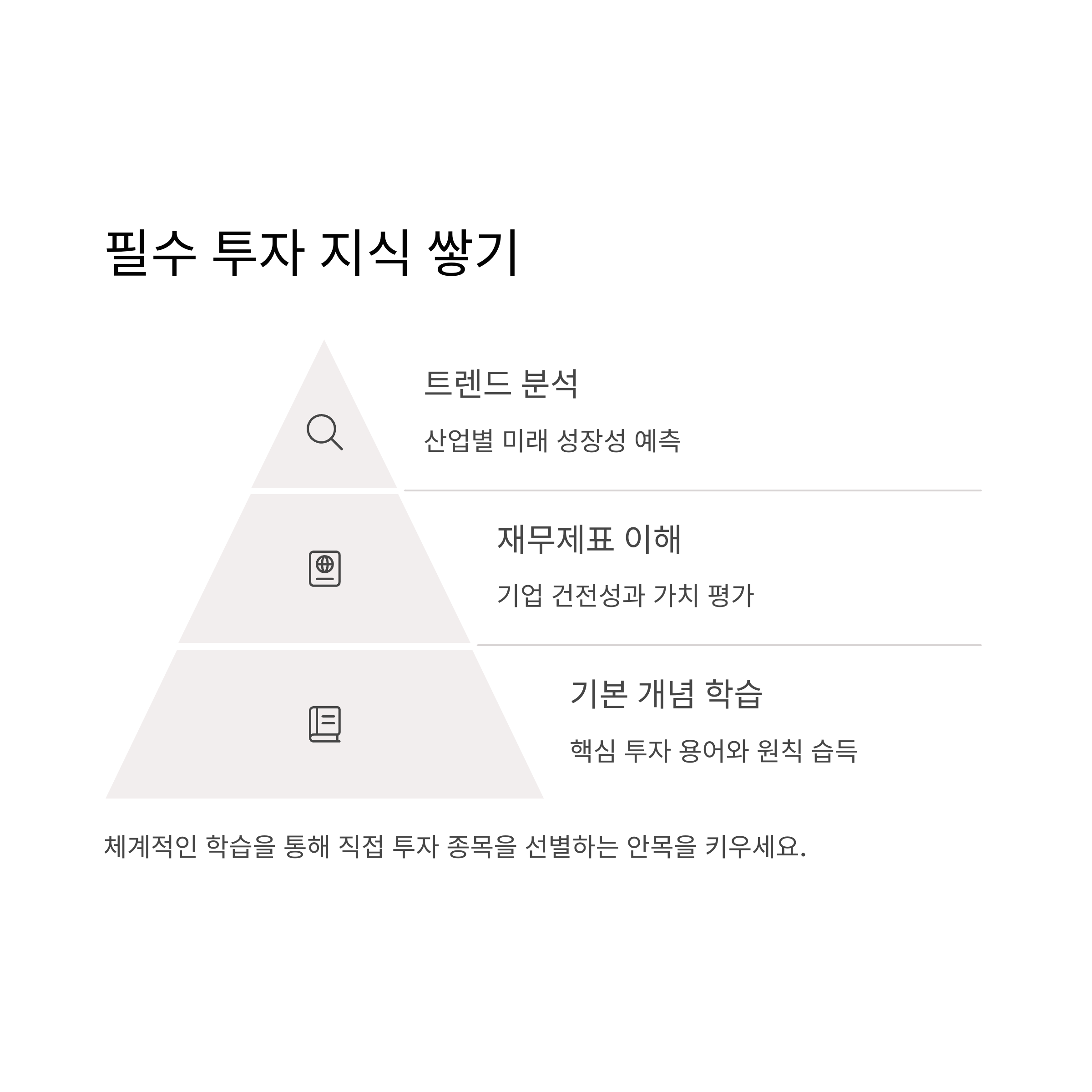 ‘어떤 종목을 사야 할까?’보다는 ‘어떤 회사가 지속 가능할까?’를 생각해야 합니다. 이를 위해선 기초 재무제표 읽기가 필수입니다. 기업의 매출, 영업이익, 순이익 흐름은 물론, ROE, 부채비율 같은 핵심 지표를 통해 기업의 재무 건전성과 성장성을 판단할 수 있어야 하며, PBR/PER의 해석 방법도 이해해야 합니다. 산업 트렌드나 글로벌 경제 흐름까지도 간단히 파악할 수 있도록, 하루 10분 뉴스 체크 습관을 들이세요.