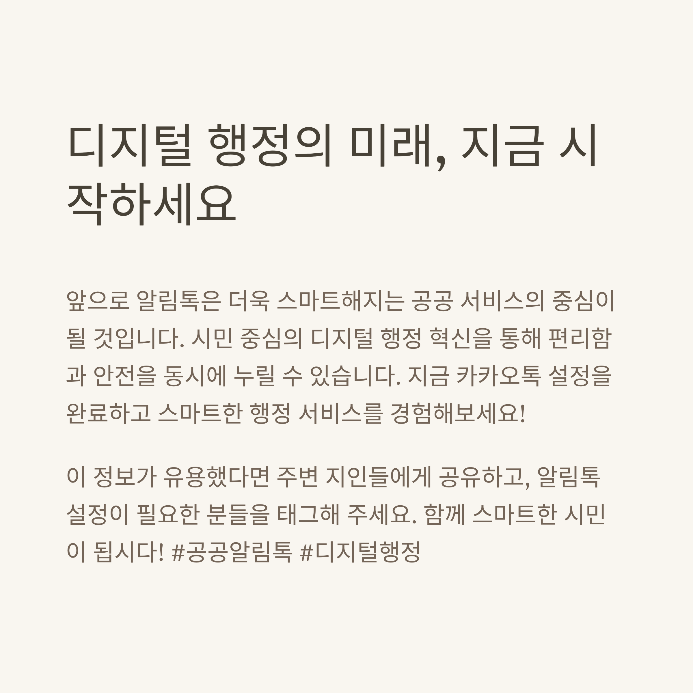 공공기관 알림톡은 단순한 메시지 서비스가 아닙니다. 국민 한 사람 한 사람에게 중요한 정보를 정확하고 안전하게 전달해주는 **디지털 시대의 공공 창구**입니다.