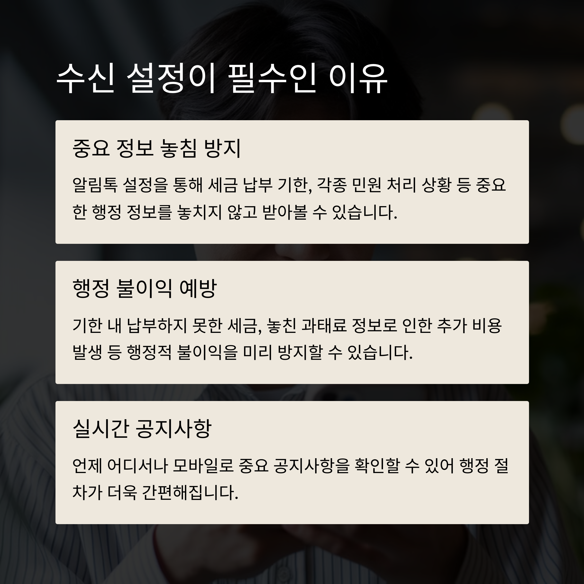 설정 한 번으로 민원, 건강, 세금, 법적 고지 등 수많은 정보를 빠르게 받을 수 있고, 정부는 예산을 절감하며, 국민은 손해를 피할 수 있는 이 서비스, 지금 바로 설정하세요!