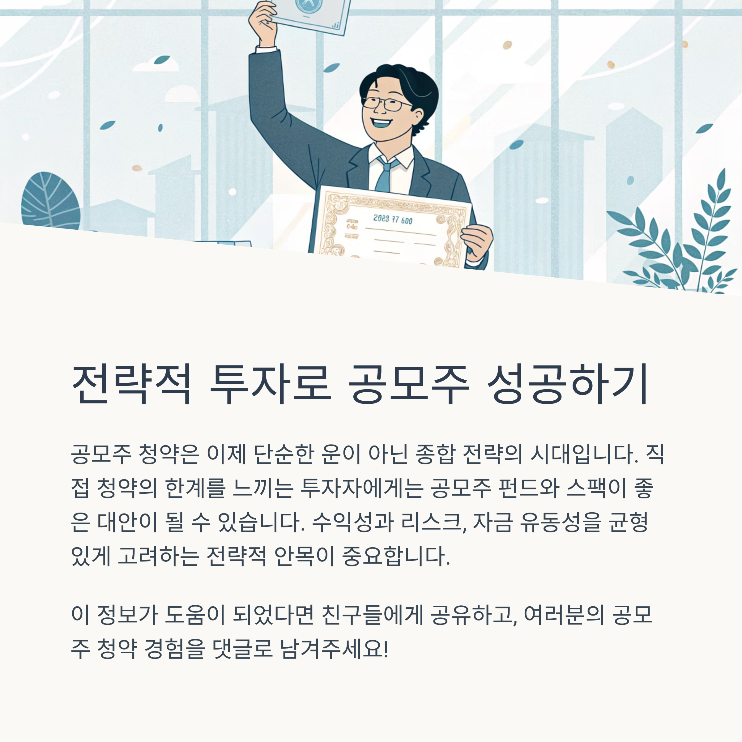 공모주 청약은 이제 단순한 운이 아닌 종합 전략의 시대입니다. 직접 청약의 한계를 느끼는 투자자에게는 공모주 펀드와 스팩이 좋은 대안이 될 수 있습니다. 특히 수익성과 리스크, 자금 유동성을 균형 있게 고려할 수 있는 전략적 안목이 점점 더 중요해지고 있습니다.