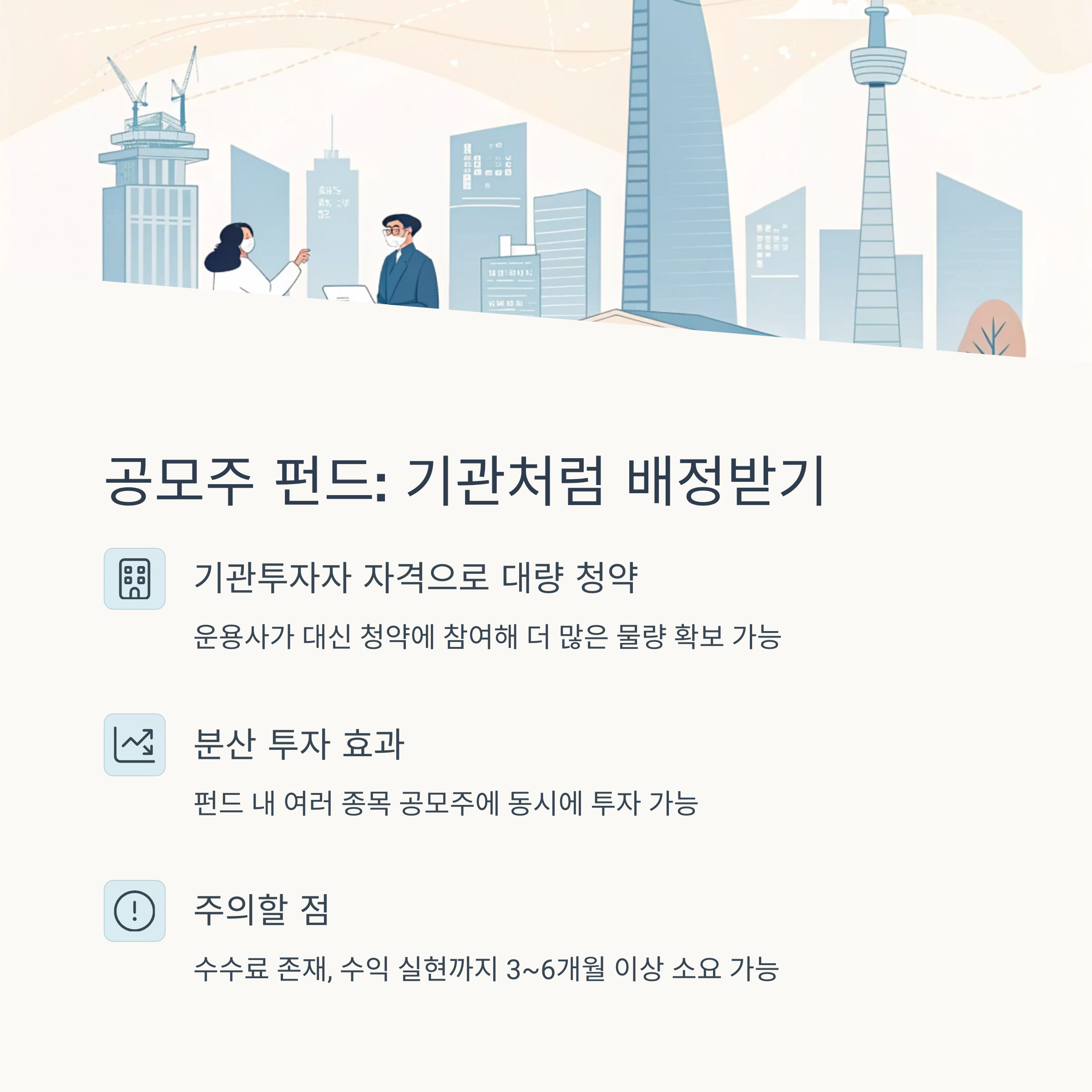 공모주 펀드는 운용사가 대신 청약에 참여해 물량을 배정받고, 그 수익을 투자자에게 분배하는 구조입니다. 개인이 일반 청약을 통해 받을 수 있는 물량은 제한적이지만, 펀드는 기관투자자 자격으로 대량 청약이 가능해 더 많은 물량을 확보할 수 있습니다.