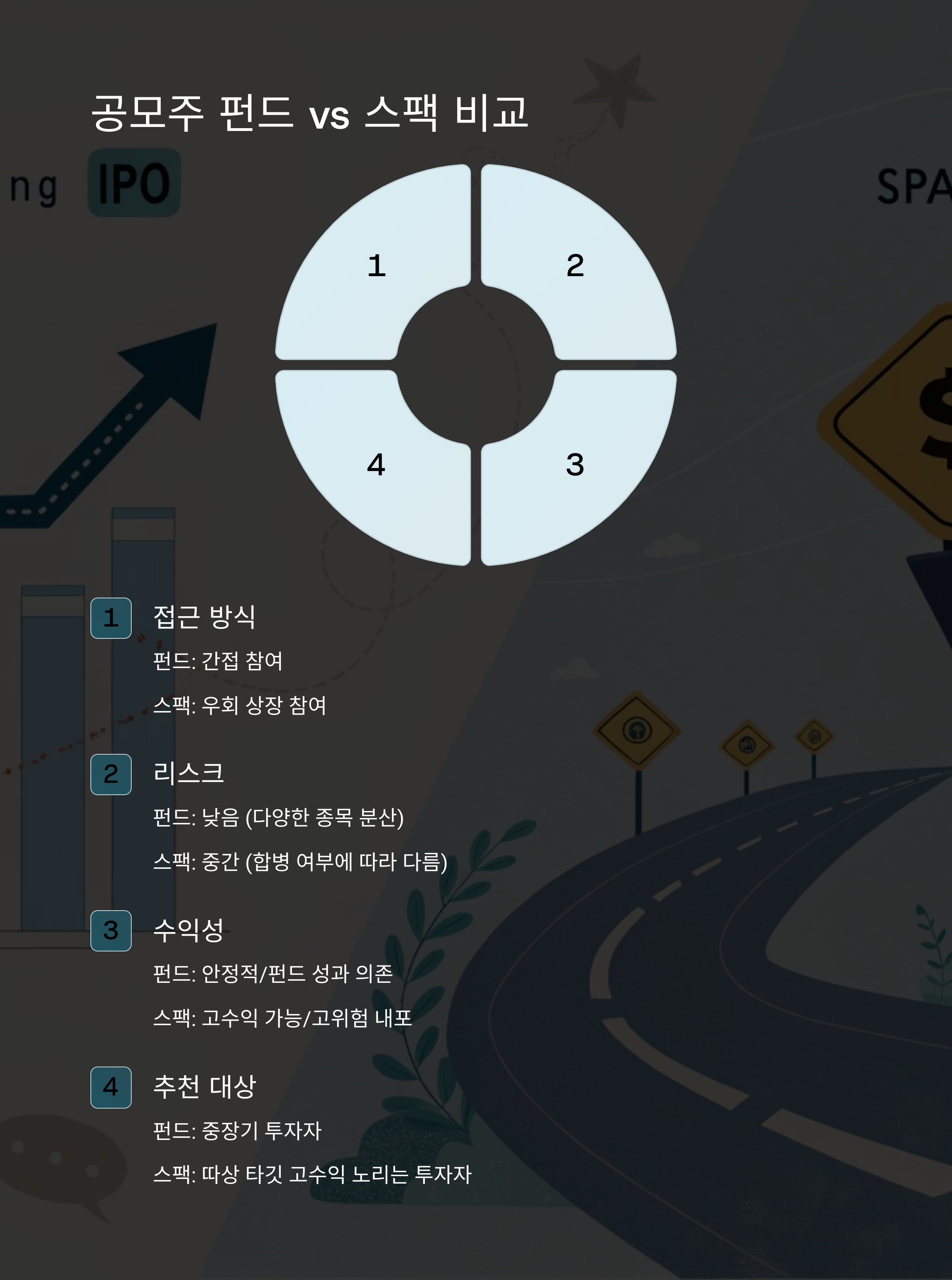 항목 공모주 펀드 스팩 접근 방식 간접 참여 우회 상장 참여 리스크 낮음 (다양한 종목 분산) 중간 (합병 여부에 따라 다름) 수익성 안정적/펀드 성과 의존 고수익 가능/고위험 내포 추천 대상 자금 유동성 좋은 중장기 투자자 공모주 경험자, 따상 타깃 고수익 노리는 투자자