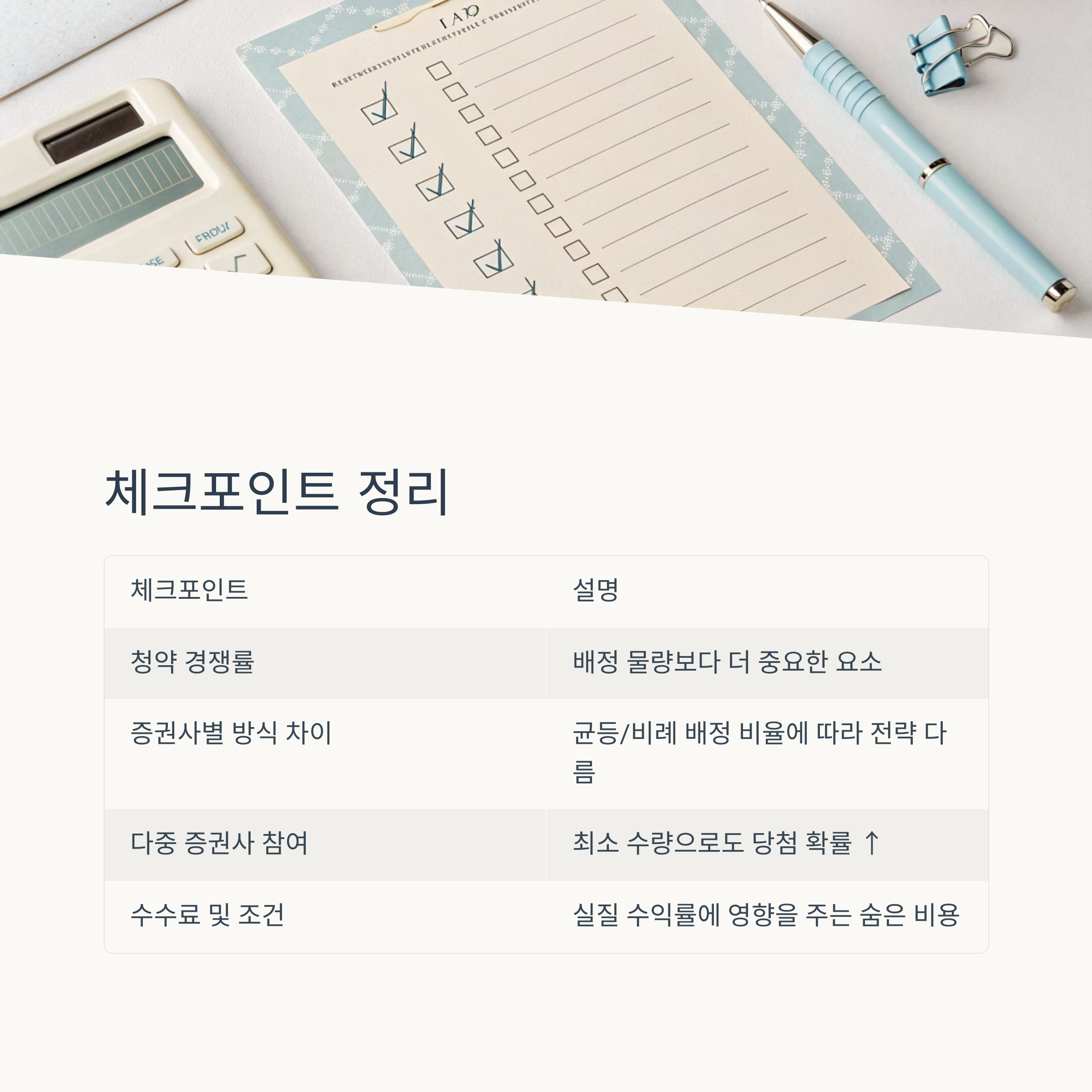 체크포인트 설명 청약 경쟁률 배정 물량보다 더 중요한 요소 증권사별 방식 차이 균등/비례 배정 비율에 따라 전략 다름 다중 증권사 참여 최소 수량으로도 당첨 확률 ↑ 수수료 및 조건 실질 수익률에 영향을 주는 숨은 비용