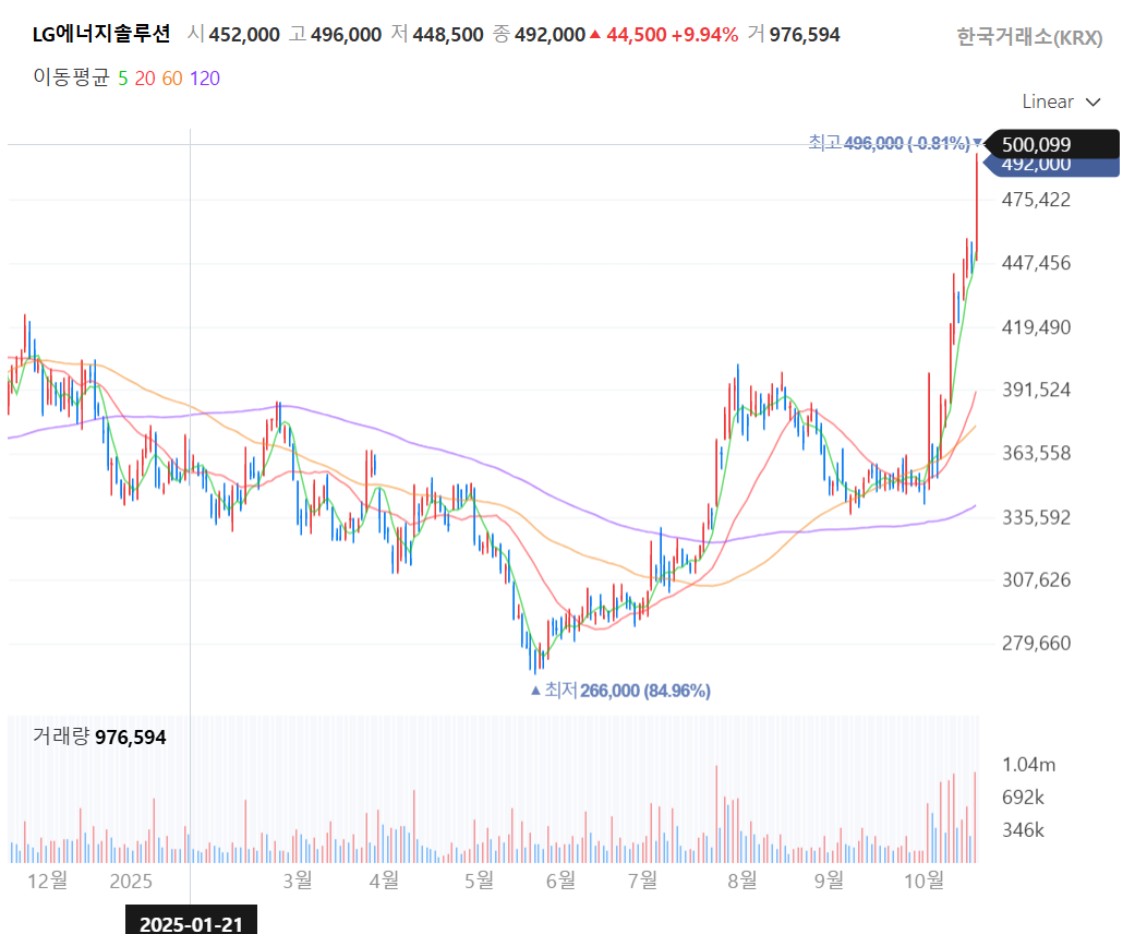 - 전체 흐름: 차트를 보면 올해 5월경 최저점(266,000원)을 찍은 이후, 바닥을 다지다가 9월 말부터 무섭게 치고 올라오는 모습이 보이죠? 그리고 오늘(10월 24일) 9.94% 급등하며 52주 신고가(496,000원) 근처인 492,000원에 마감했어요. 완벽한 상승 추세입니다.