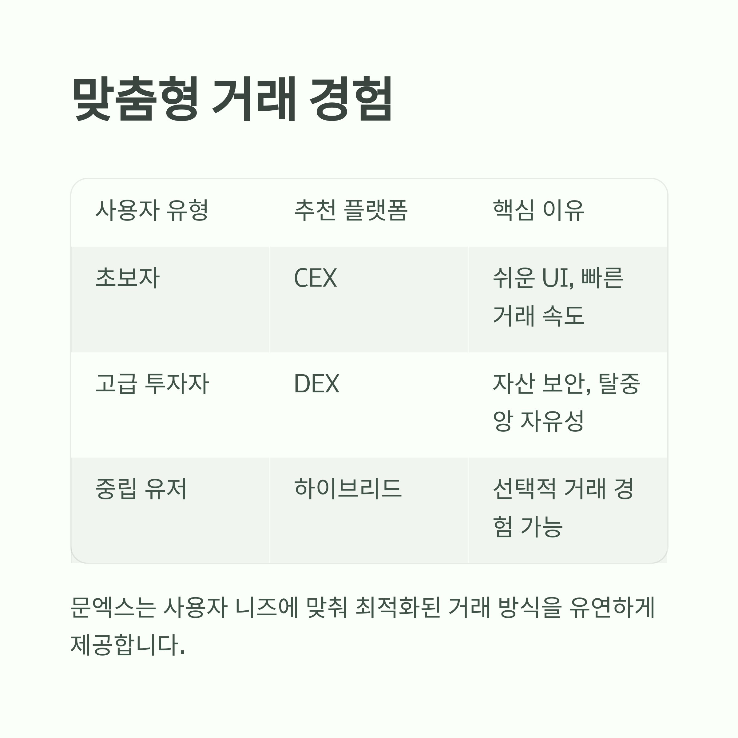 | 중립 유저 | 하이브리드 | 선택적 거래 경험 가능 |