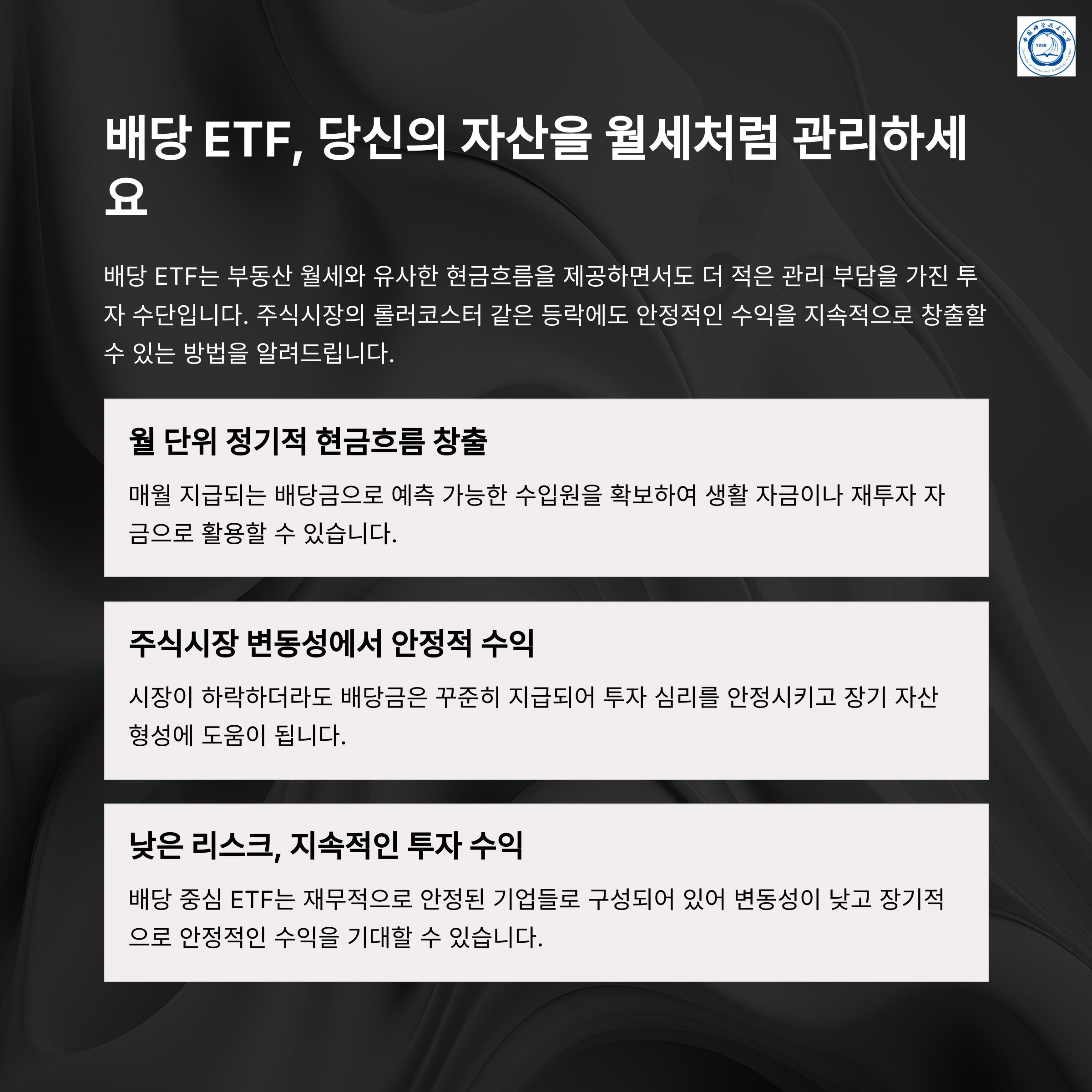 배당 ETF는 기본적으로 ETF가 포함하고 있는 주식들이 지급하는 배당금을 기반으로 합니다. ETF를 통해 여러 배당주에 동시에 투자하면 개별 기업 리스크를 분산시키면서도 배당 수익을 챙길 수 있습니다. 또한, 일부 ETF는 매월 배당을 지급하도록 설계되어 있어 정기적인 현금흐름을 기대할 수 있습니다.