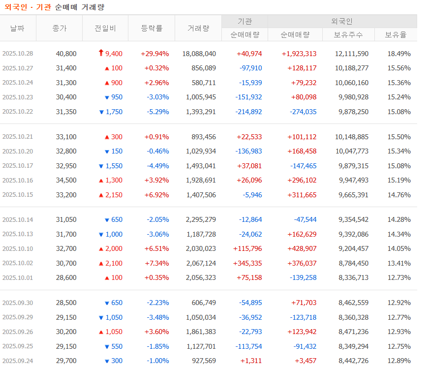 10월 28일, 주가가 폭등한 날 '외국인'이 무려 192만 주를 순매수했어요. 기관도 4만 주를 샀고요. 그전부터 외국인들은 꾸준히 지분을 늘려오고 있었네요. (보유율 15.24% → 18.49%) '큰손'인 외국인들이 이 회사의 미래 가치를 긍정적으로 보고 베팅하고 있다는 뜻으로 해석할 수 있습니다.
