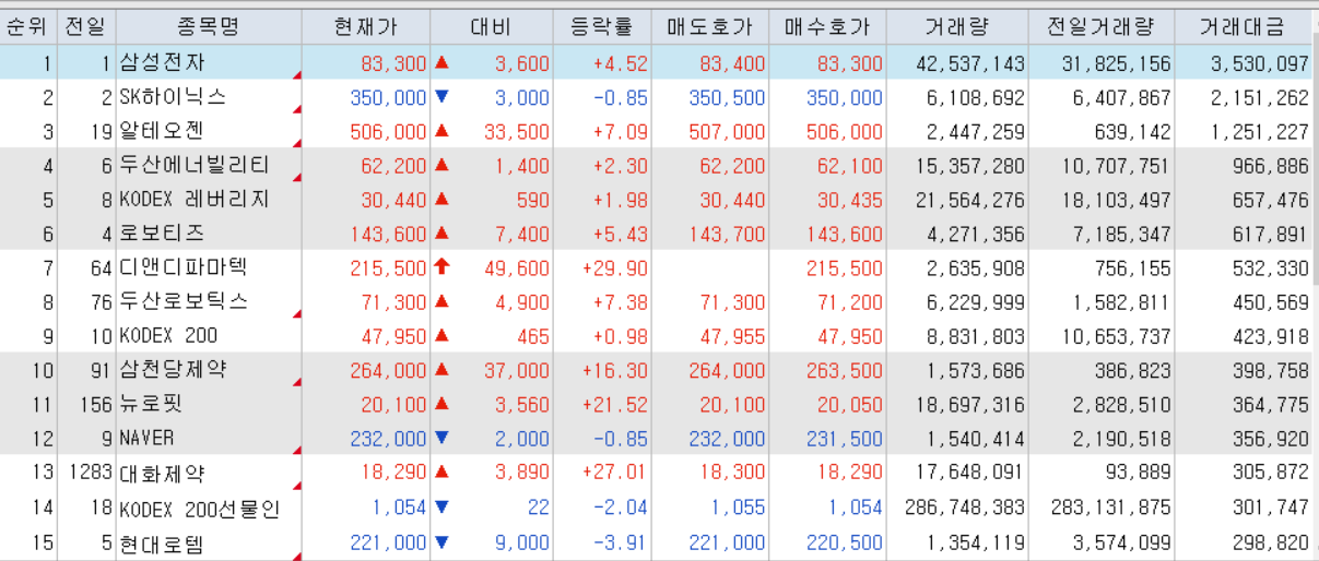 | 코스피 | 삼성전자, 두산에너빌리티, 삼성전자우, 현대차, 삼성전기 | 삼성전자, SK하이닉스, KODEX 코스닥150레버리지, 두산에너빌리티, LG이노텍 |