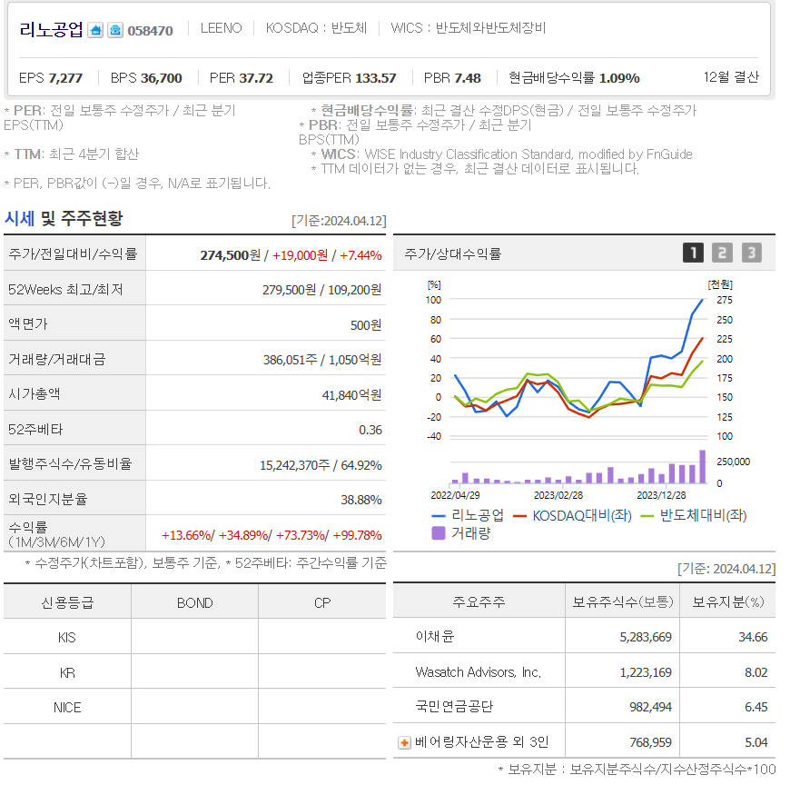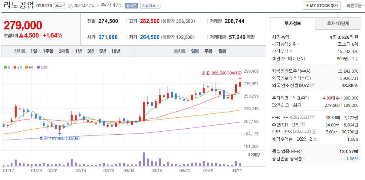 인공지능(AI) 산업 성장에 4분기 호실적을 달성한 리노공업이 주목받고 있다. 리노공업은 반도체 소재·부품·장비(소부장) 기업으로, 반도체 후공정 테스트 소켓을 만든다. 국내·미국 주식 투자