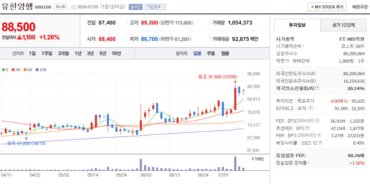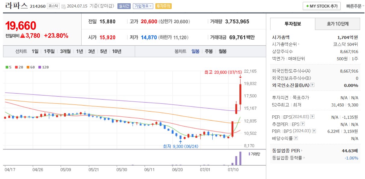 3거래일 동안 크게 상승을 하면서 9천원대 가격에서 19660원 까지 수직 상승을 했습니다.