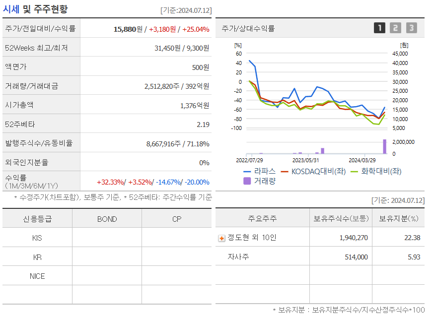 대주주 지분이 22.8% 정도로 조금 적은 편이고 유통주식수가 71% 정도 되는 회사입니다.