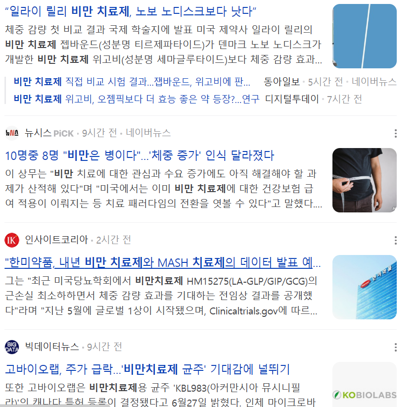 먼저 비만 치료제 기사를 보시면 여러 가지가 나옵니다.