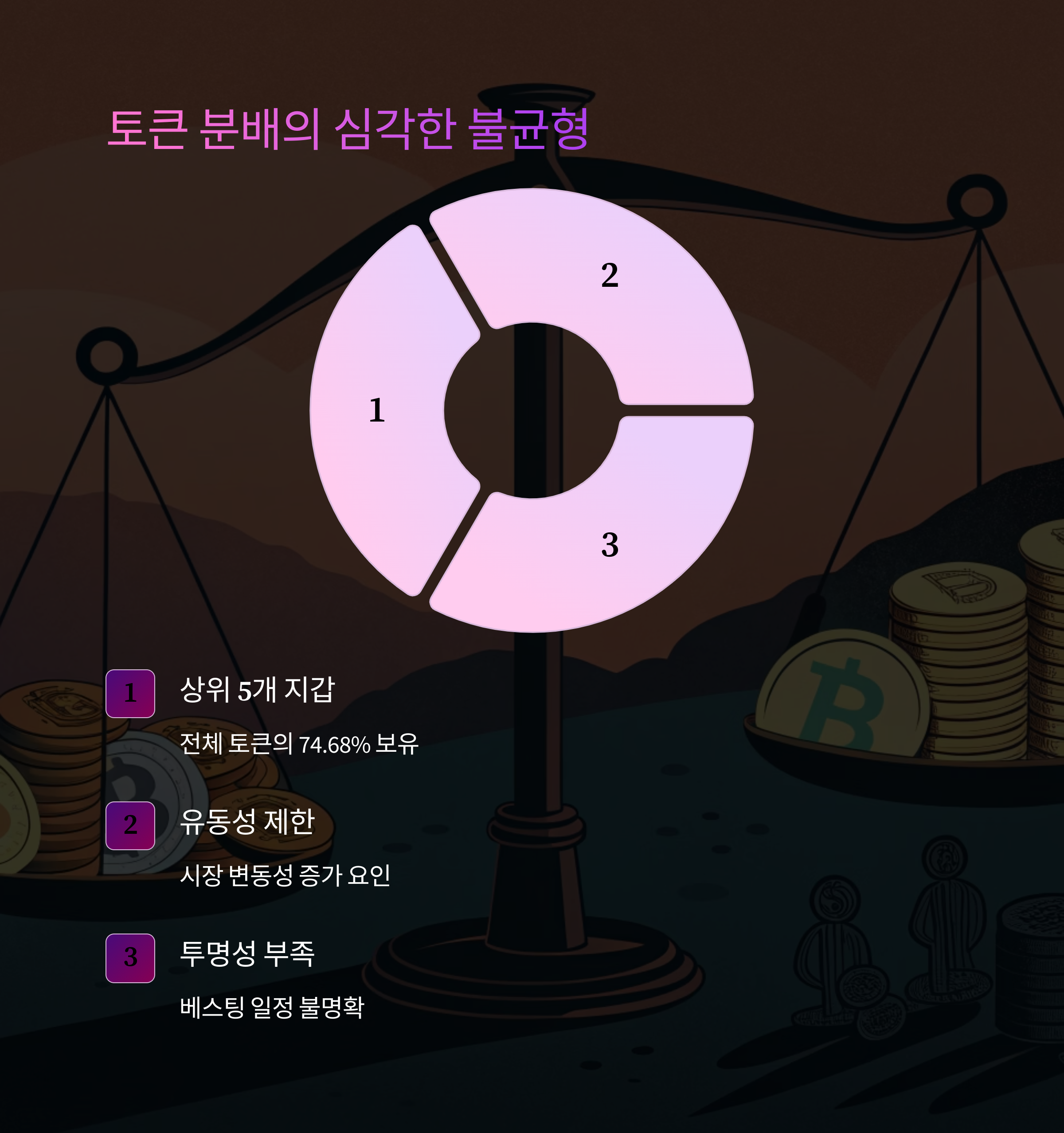 솔레이어의 토큰 분배 구조도 문제로 지적됩니다. 상위 5개 지갑이 전체 토큰의 74.68%를 보유하고 있으며, 이는 시장의 유동성을 제한하고 가격 변동성을 증가시키는 요인으로 작용합니다. 또한, 투명한 베스팅 일정의 부재는 투자자들의 불신을 초래하고 있습니다.
