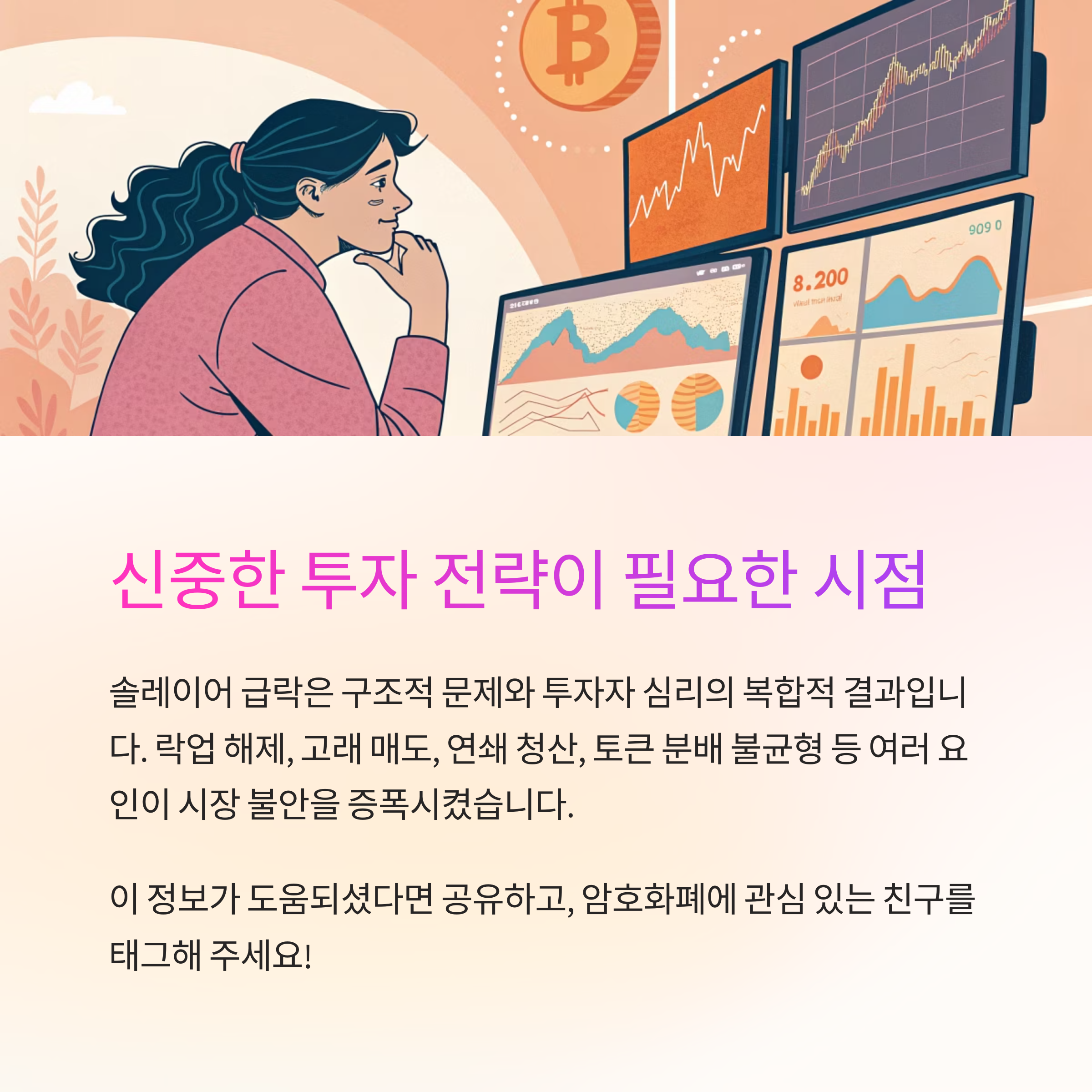 솔레이어의 급락은 단순한 시장 조정이 아닌, 구조적인 문제와 투자자 심리의 복합적인 결과로 보입니다. 락업 해제, 고래 매도, 연쇄 청산, 토큰 분배의 불균형 등 여러 요인이 복합적으로 작용하며 시장의 불안을 증폭시켰습니다. 투자자들은 이러한 요소들을 면밀히 분석하고, 신중한 투자 전략을 수립해야 할 시점입니다.