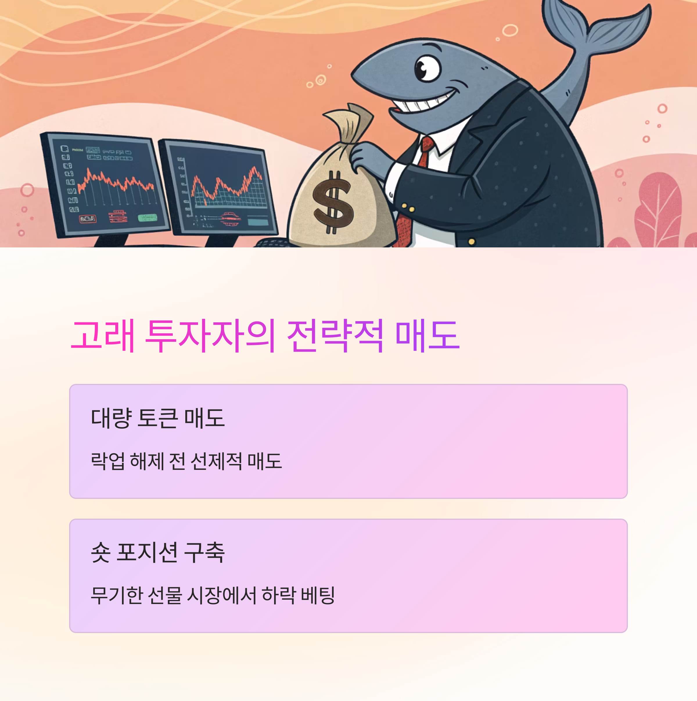 락업 해제를 앞두고 한 고래 투자자가 대량의 토큰을 매도하고, 동시에 무기한 선물 시장에서 숏 포지션을 취한 것으로 알려졌습니다. 이 전략은 시장에 부정적인 신호를 보내며 가격 하락을 가속화시켰습니다.