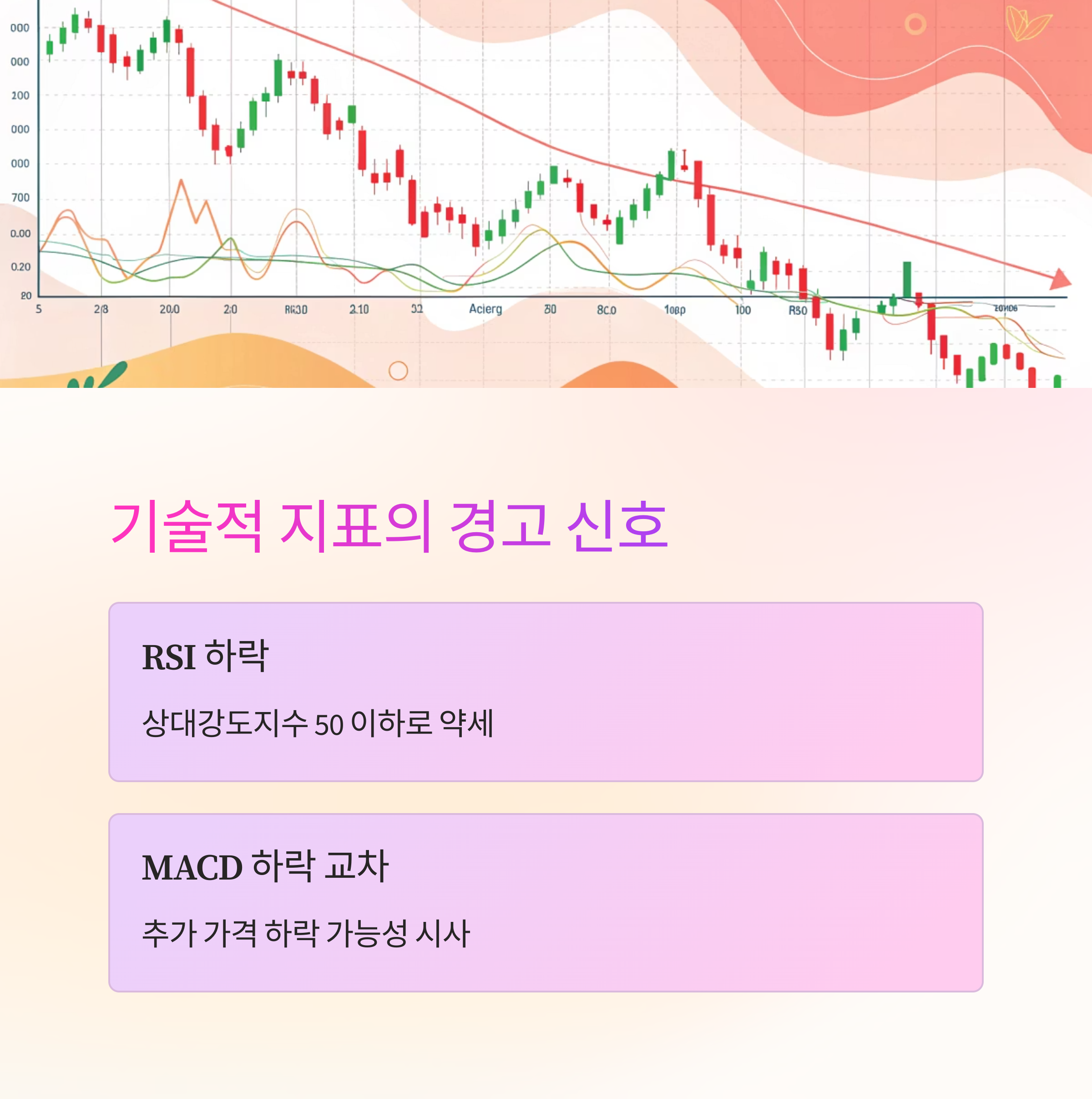 기술적 지표들도 하락세를 시사합니다. 상대강도지수(RSI)는 50 이하로 떨어졌으며, 이동평균수렴확산지수(MACD)는 하락 교차를 나타내고 있습니다. 이는 추가적인 가격 하락의 가능성을 높이는 신호로 해석됩니다.