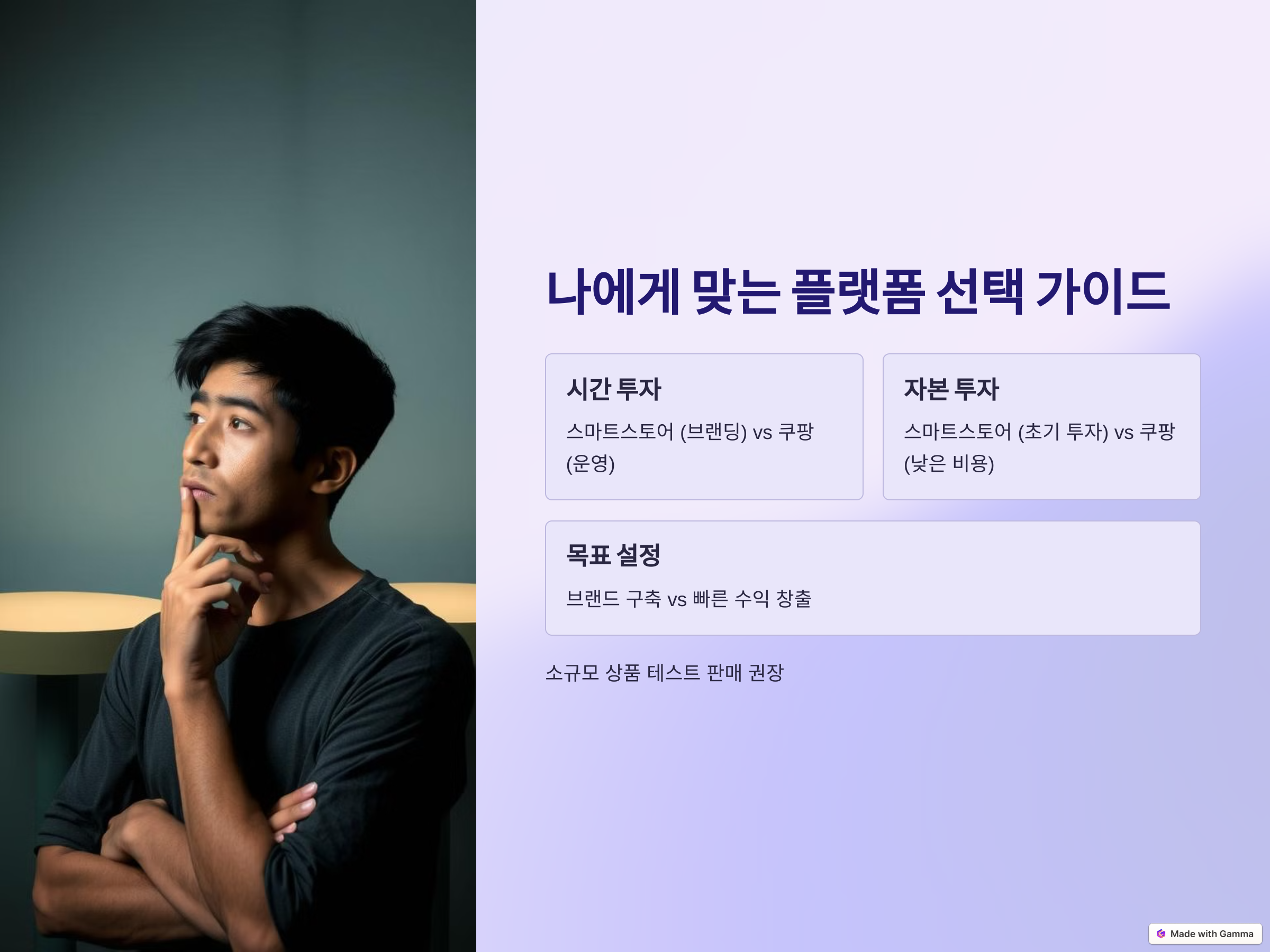 결론적으로 두 플랫폼은 운영 방식에 차이가 크기 때문에 본인의 라이프스타일과 리소스를 고려해 결정하는 것이 바람직합니다. 직접 운영과 브랜딩을 원한다면 스마트스토어, 간편한 시스템과 빠른 판매를 원한다면 쿠팡이 어울립니다. 특히 리스크가 적은 소규모 테스트부터 시작하는 전략이 초보자에게는 가장 안전합니다. 두 플랫폼 모두 잠재력은 충분하므로 비교 분석 후 자신 있게 시작해 보세요!