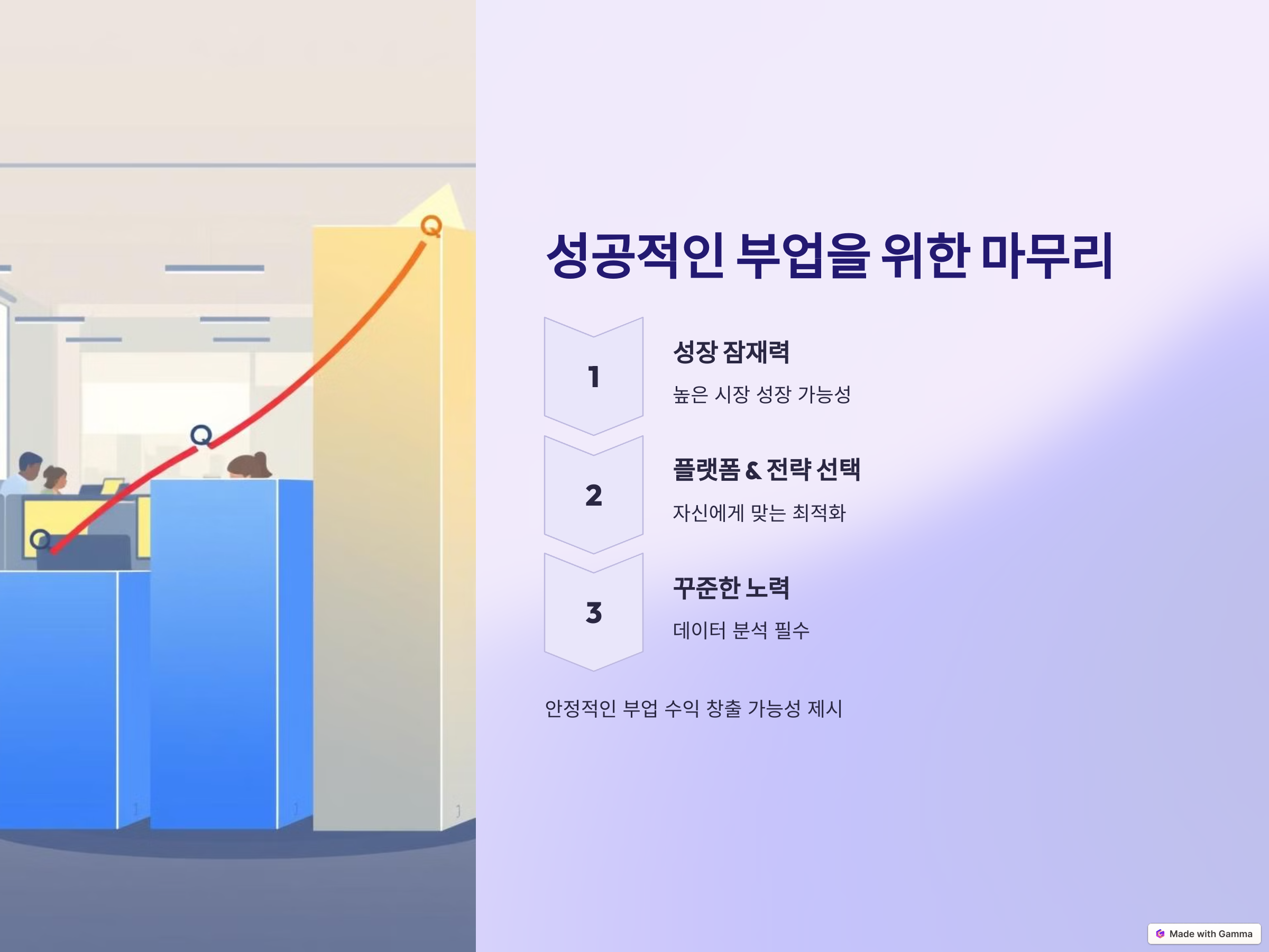 각각의 특징을 살펴보며 여러분의 상황에 맞는 방향을 찾을 수 있도록 도와드릴게요. 부업의 첫걸음을 뗄 준비 되셨나요?