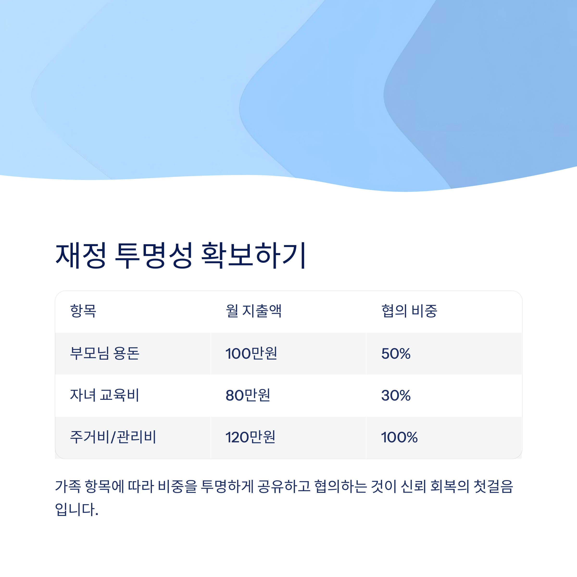 "가족 항목에 따라 비중을 투명하게 공유하고 협의하는 것이 신뢰 회복의 첫걸음입니다."