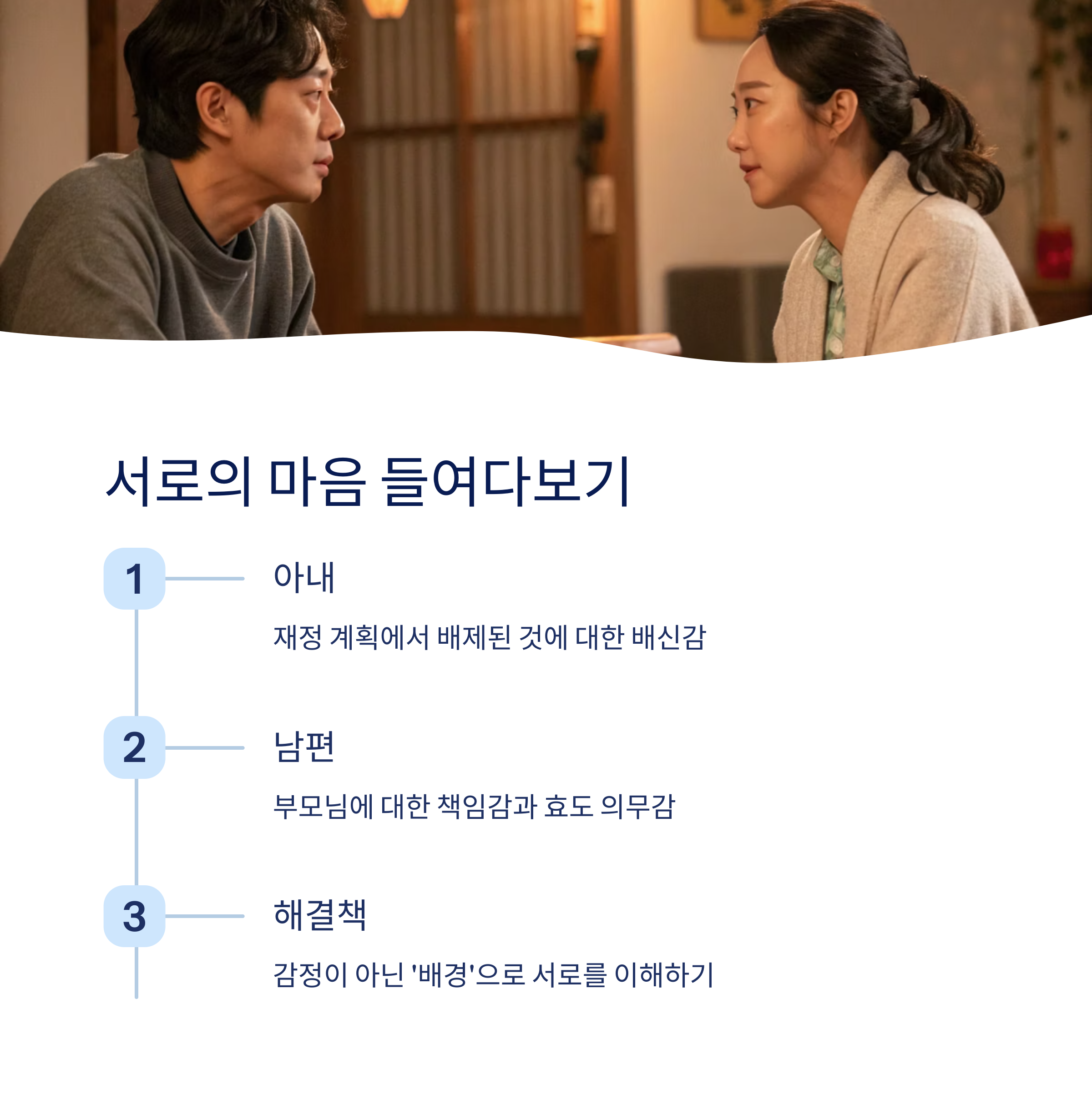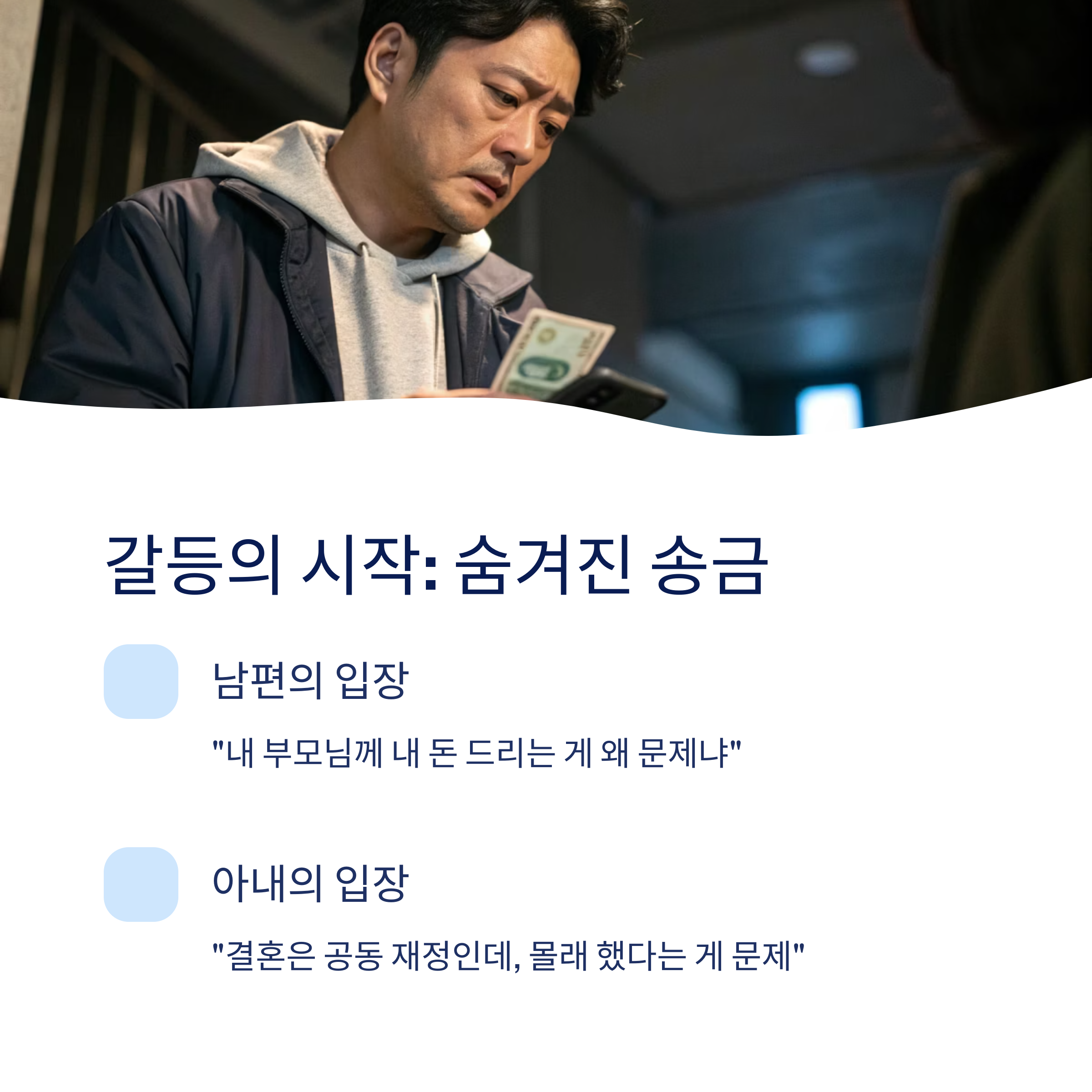 아내 입장에서는 재정 계획에서 배제된 것에 대한 배신감이 크고, 남편 입장에서는 "부모에 대한 도리를 다한 것"이라 여깁니다.