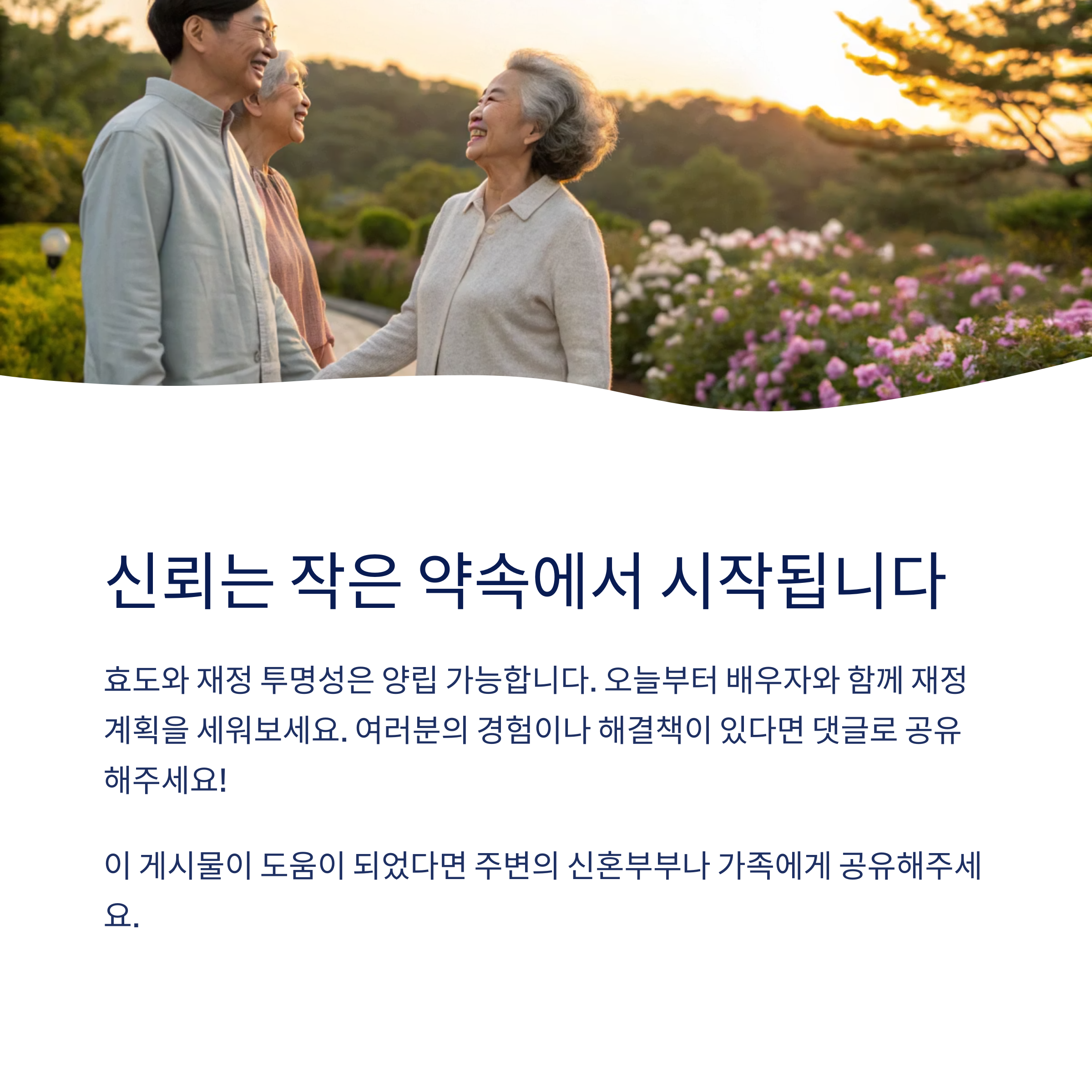 재정은 신뢰를 보여주는 가장 현실적인 수단이라는 점에서, 투명성과 합의는 부부관계에 핵심입니다.