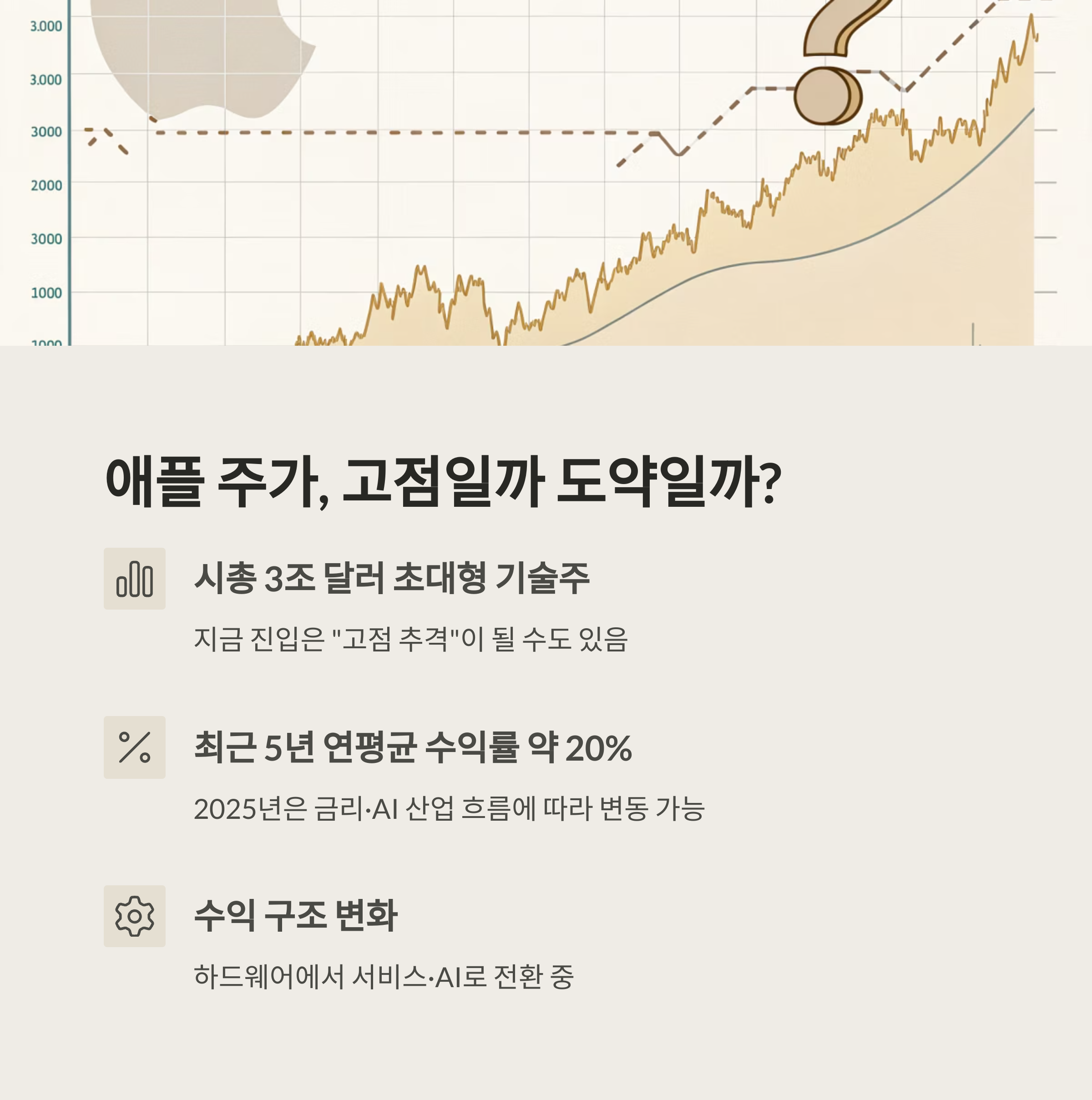 최근 5년간 애플의 연평균 수익률은 약 20%지만, 2025년 전망은 시장 전반의 금리·AI 산업 흐름과 밀접하게 연결돼 있어 절대 낙관할 수 없습니다.