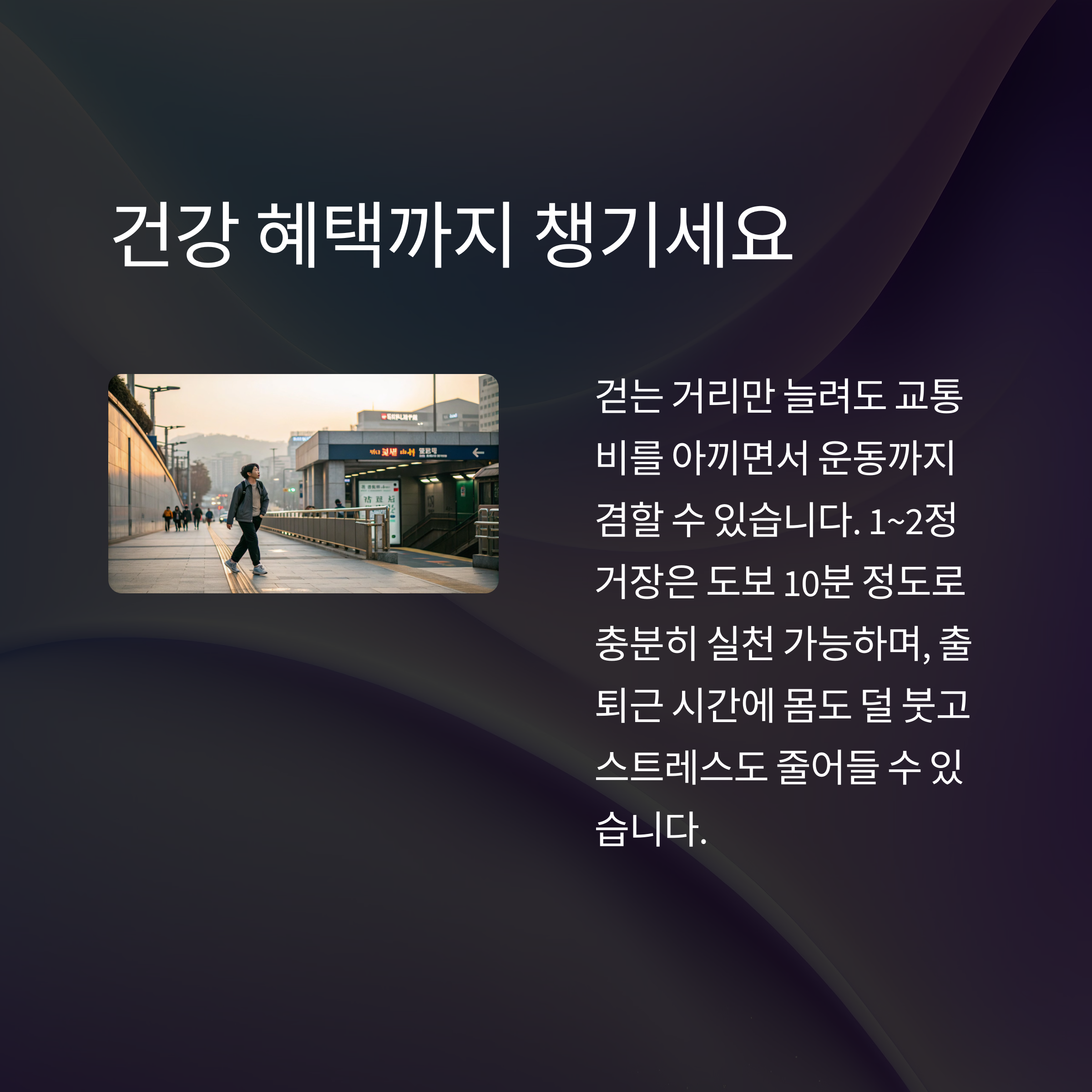 걷는 거리만 늘려도 교통비를 아끼면서 운동까지 겸할 수 있습니다.