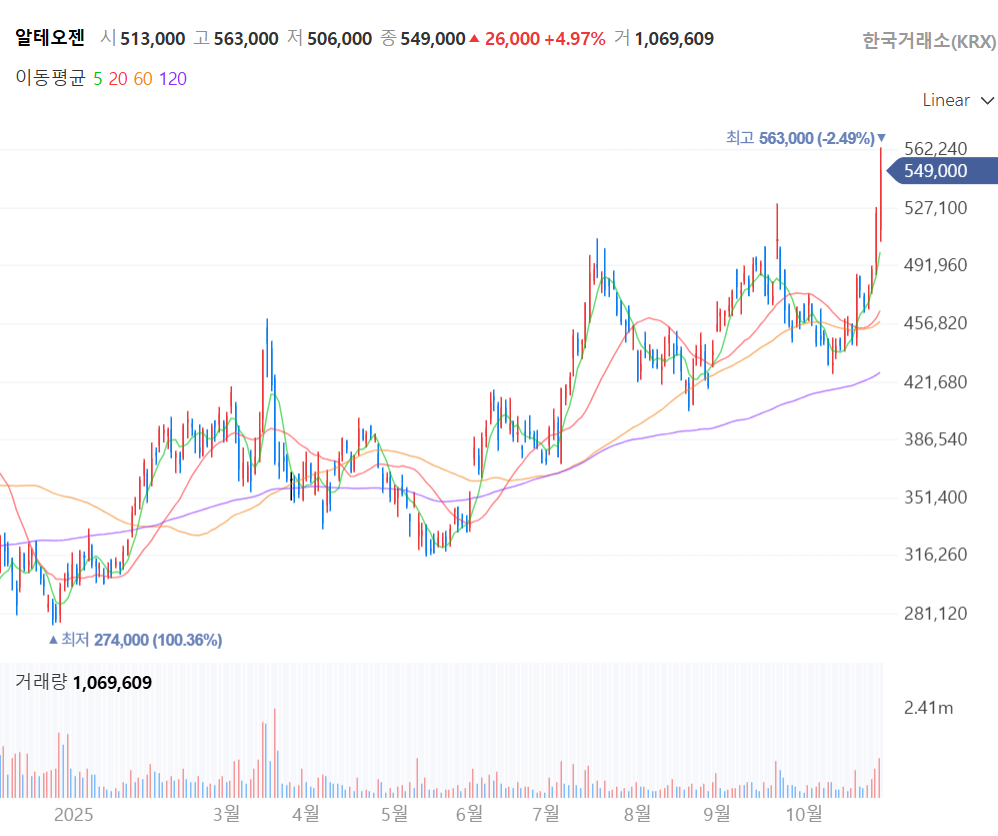- 전체적인 흐름: 2025년 초부터 꾸준히 오르다가(우상향), 10월 말~11월 초에 'MSD 로열티 잭팟' 뉴스와 함께 하늘 높은 줄 모르고 폭발적인 상승을 보여주고 있어요. 11월 3일에는 563,000원이라는 역사적 신고가도 찍었네요.