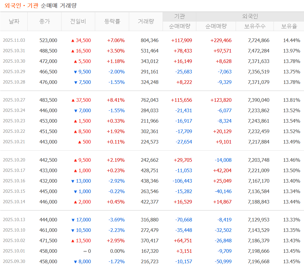 - 위의 외국인/기관 매매 동향 표(2025.10.27~11.03)를 보세요.