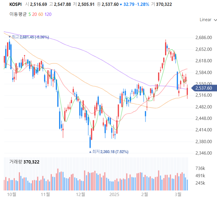 오늘 코스피 지수는 미 트럼프 관세이슈로 미증시가 폭락한 가운데 우리 증시도 장초반 크게