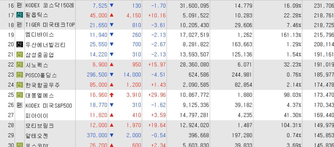 오늘 거래대금 상위종목에서는 어제 상승했던 제약바이오 종목과 로봇, 유리기판, 신규상장주가 큰 상승을