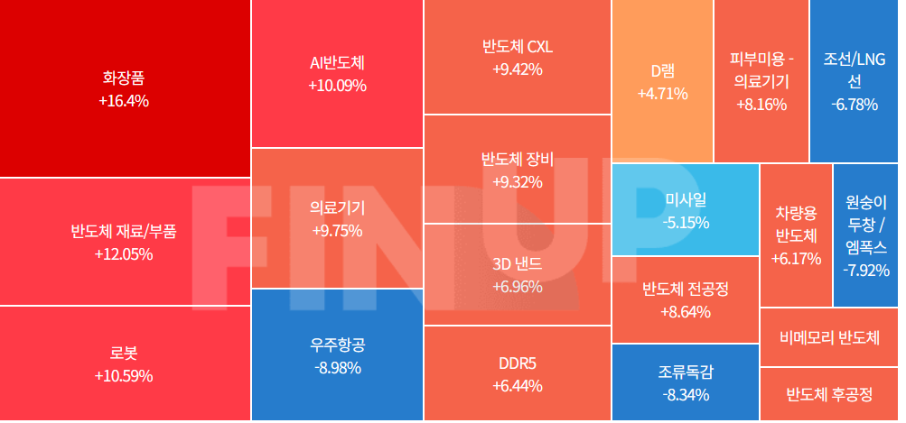 오늘의 특징주 섹터는 화장품, 반도체, 로봇, 신규상장, 개별이슈 등.