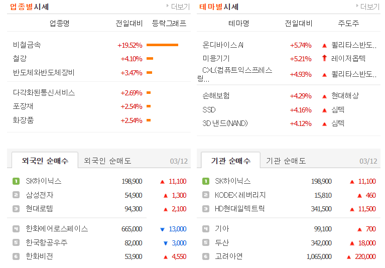 화장품섹터에서도 상승을 보임. 외국인 기관 순매수 상위 종목에서 SK하이닉스가 크게 순매수가 들어옴.