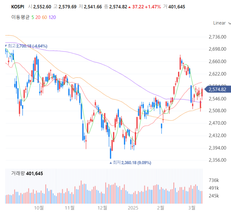 코스피 지수는 1.47% 상승한 2574.82로 마감. 외국인과 기관이 각각 3790억 원, 319억 원 순매수.
