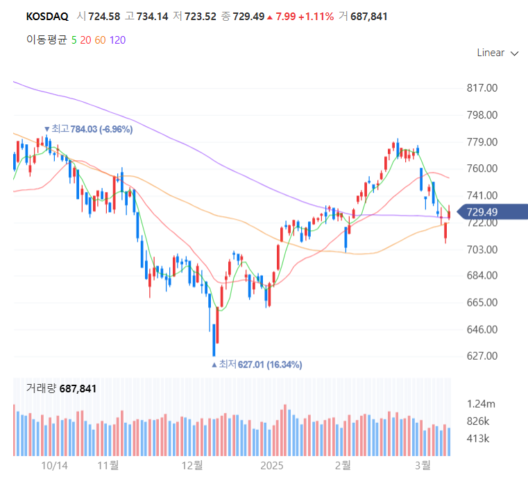 코스닥 지수는 1.11% 상승한 729.49로 마감. 외국인과 기관이 각각 138억원 93억 원 순매수.