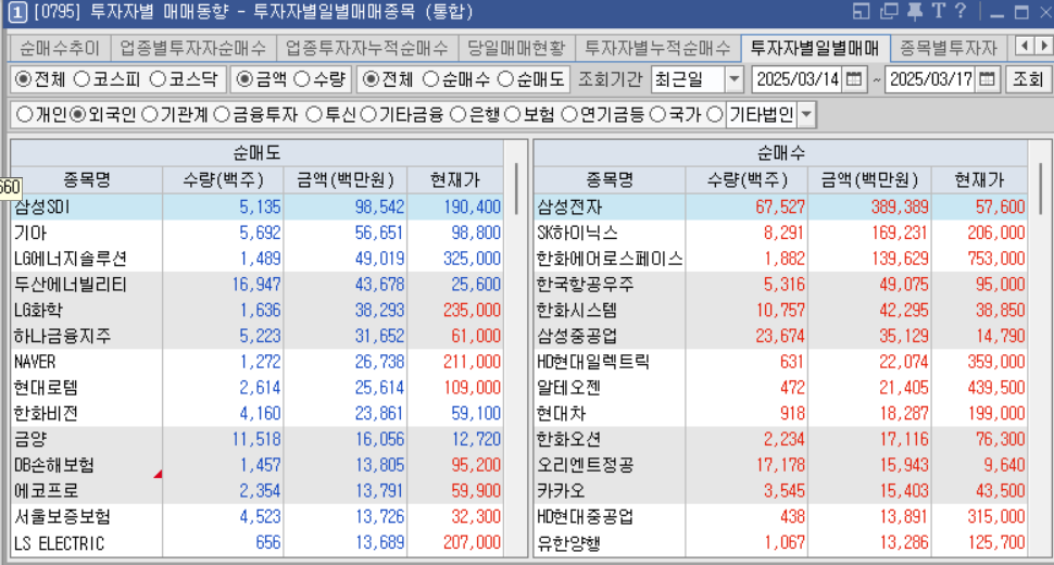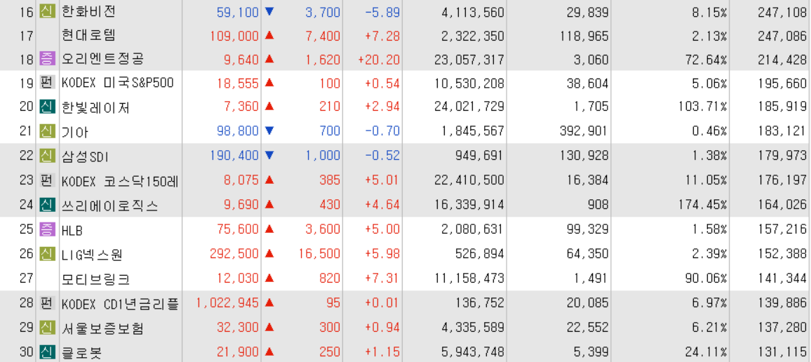오늘 기관순매수 종목은 반도체, 방산, 조선, 전력, 바이오, 자동차, 금융 등을 순매수했고