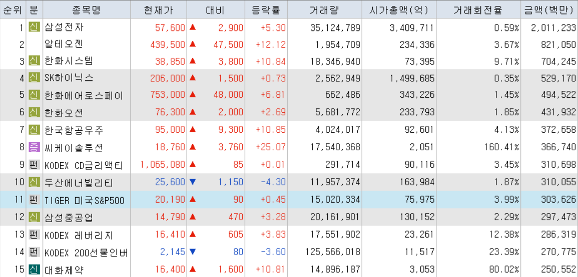 오늘 거래대금 상위 종목에서는 코스피 시총 1위 종목 삼성전자가 5% 넘게 상승하며 1위
