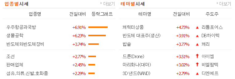 시가 총액 상위 종목에서는 삼성전자가 5% 넘게 상승을 보였고 , 바이오, 방산, 조선, 금융 등이 상승함.
