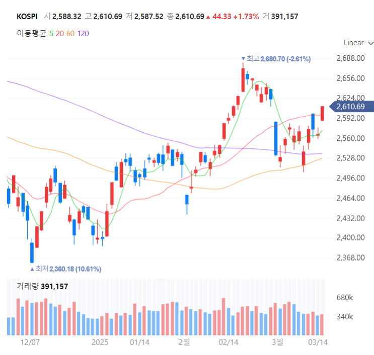 코스피 지수는 1.73% 상승한 2610.69로 마감. 외국인과 기관이 각각 6169억 원, 4952억 원 순매수.