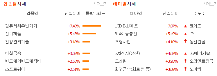크게 상승을 보였고, 자동차, 방산, 조선,금융 등이 상승함.