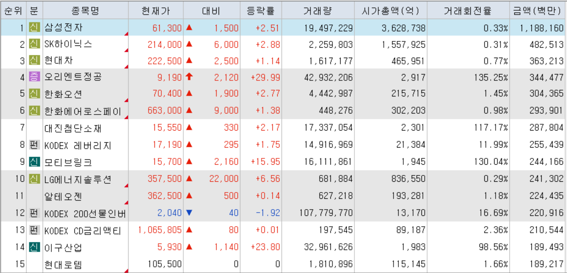 거래대금 순으로 보면 오리엔트정공 > 동신건설 > 에이텍 순으로 보임.