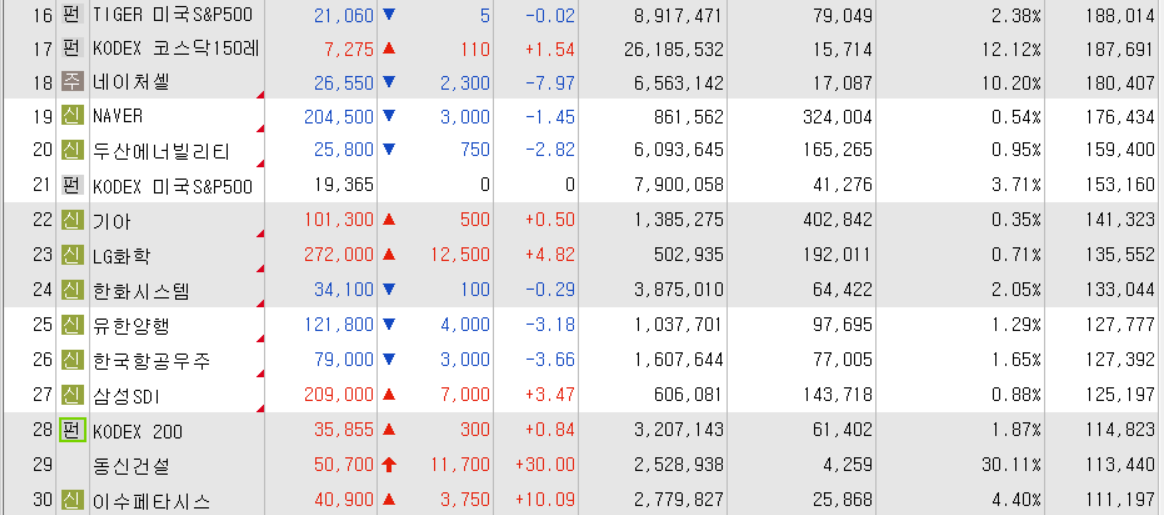 오늘 거래대금 상위 종목에서는 반도체, 자동차 부품, 2차 전지, 구리, 이재명 테마주가 크게 상승을  보였고