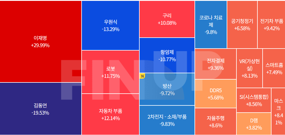 변동성을 크게 가질듯함. 거래대금 상위 종목에도 이재명 테마주가 올랐는데 계속 상승이 나올지는 미지수.