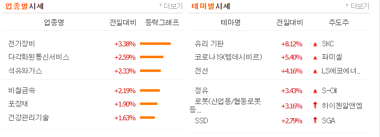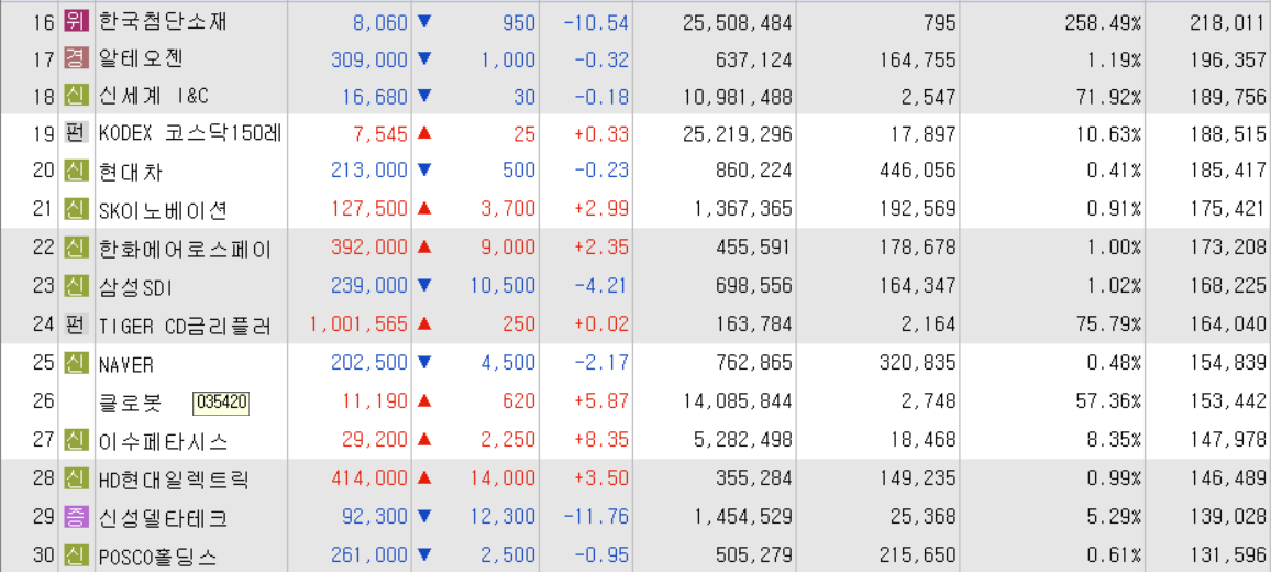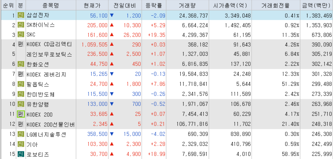 오늘 거래대금 상위 종목에서는 SKC 유리기판 이슈로 크게 상승을 보이면서 상위에 올랐음.