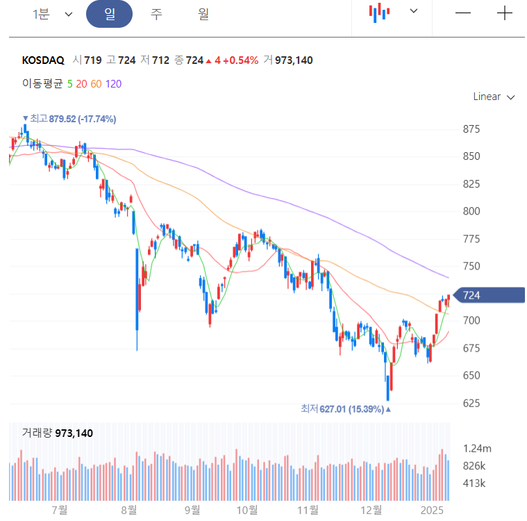 코스닥 지수 723.52로 3.89(0.54%) 상승 마감.