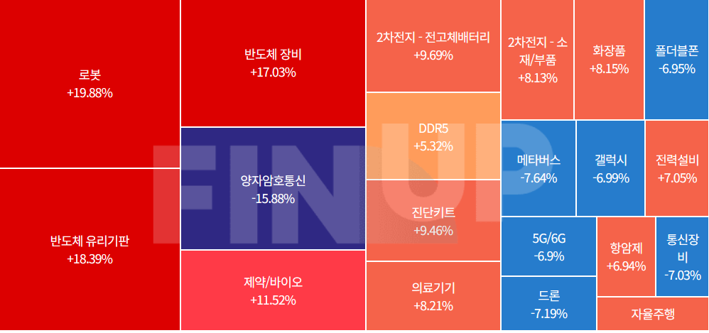 그리고 로봇 관련주 레인보우로보틱스, 클로봇, 로보티즈 종목 상위에 오르면서 크게 상승.